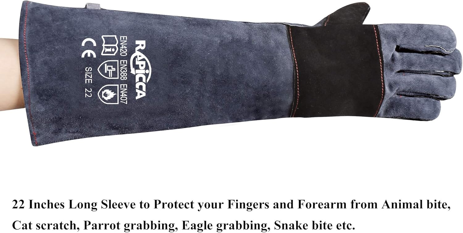 • THICK AND DURABLE - RAPICCA Leather Animal Handling Gloves are made from carefully-selected thick and soft shoulder split natural cowhide leather which is Puncture Resistant, Cut Resistant, Bite Resistant, Heat Resistant, Oil Resistant and Fire Resistant. This pair of heavy duty gloves will last for a long time.