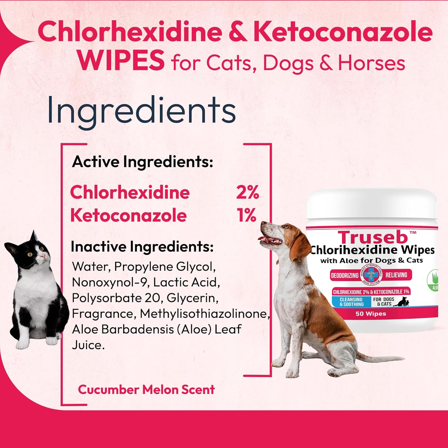 Truseb Topical for Dogs, Cats and Horses - with Aloe for Cleansing (Ketoconazole & Chlorhexidine Wipes, 100 Count)