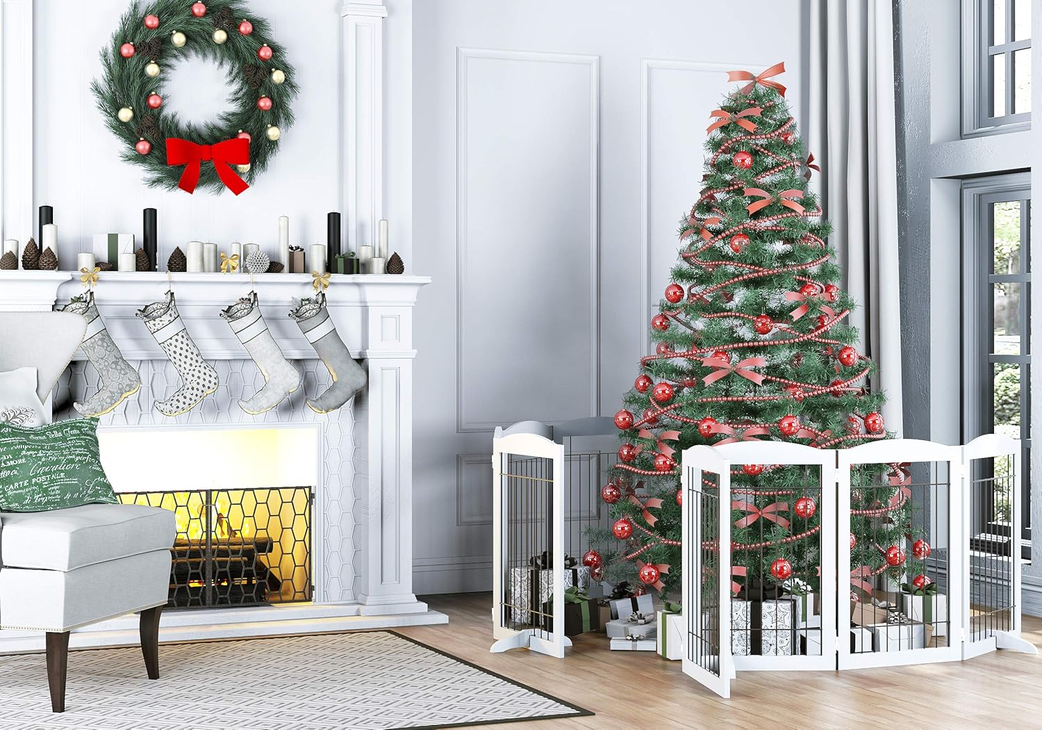 Spirich Free Standing Foldable Wire Pet Gate for Dogs, 80 inches Extra Wide, 30 inches Tall 4 Panels Dog Gate for the House, Doorway, Stairs, Pet Puppy Safety Fence,Set of Support Feet Included, White