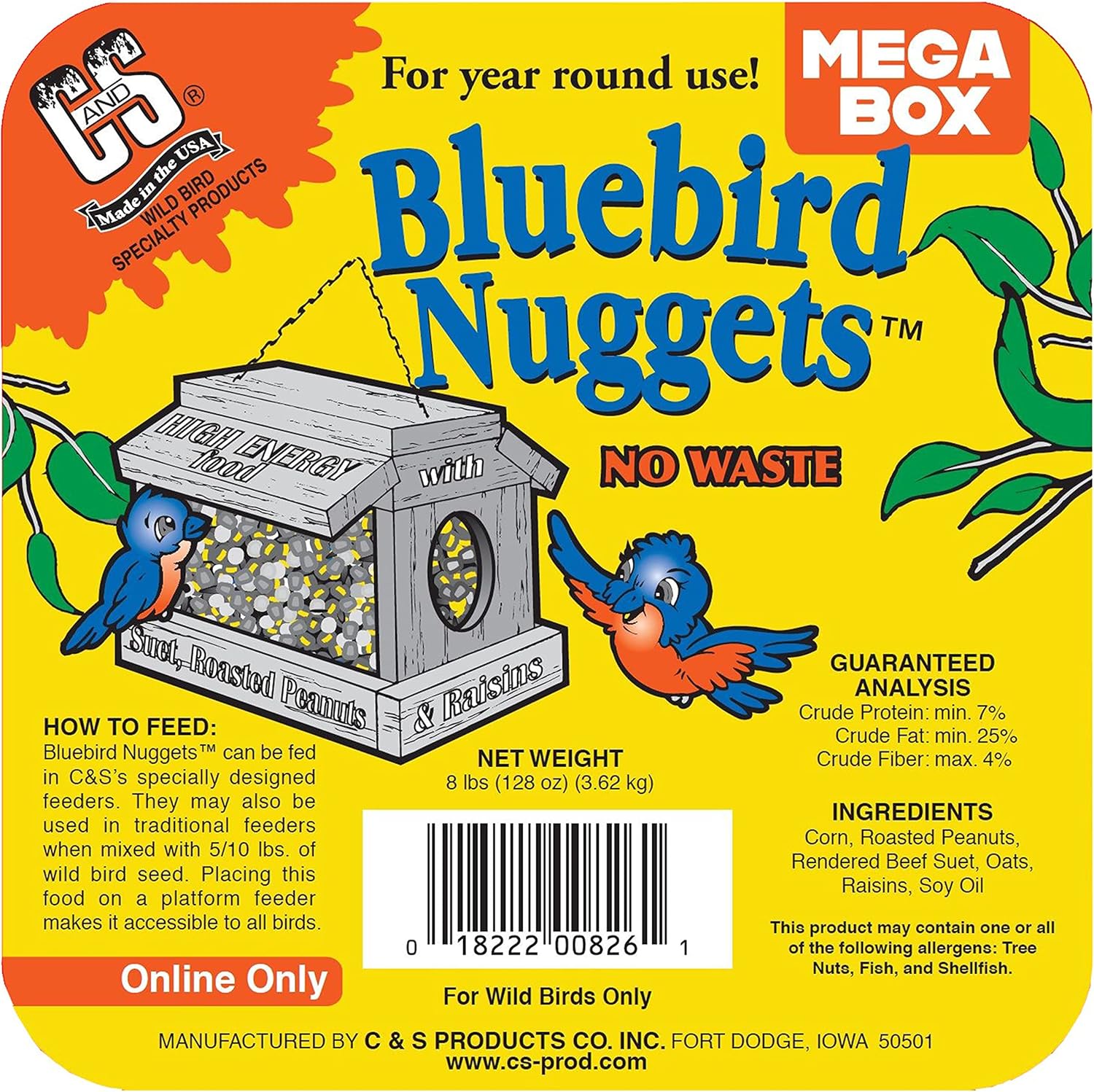 • ECONOMICAL & EASY TO USE compared to traditional seeds. C&S Bluebird Suet Nuggets combined with a nugget feeder offer a great value for todayโ€™s wild bird feeding customer.