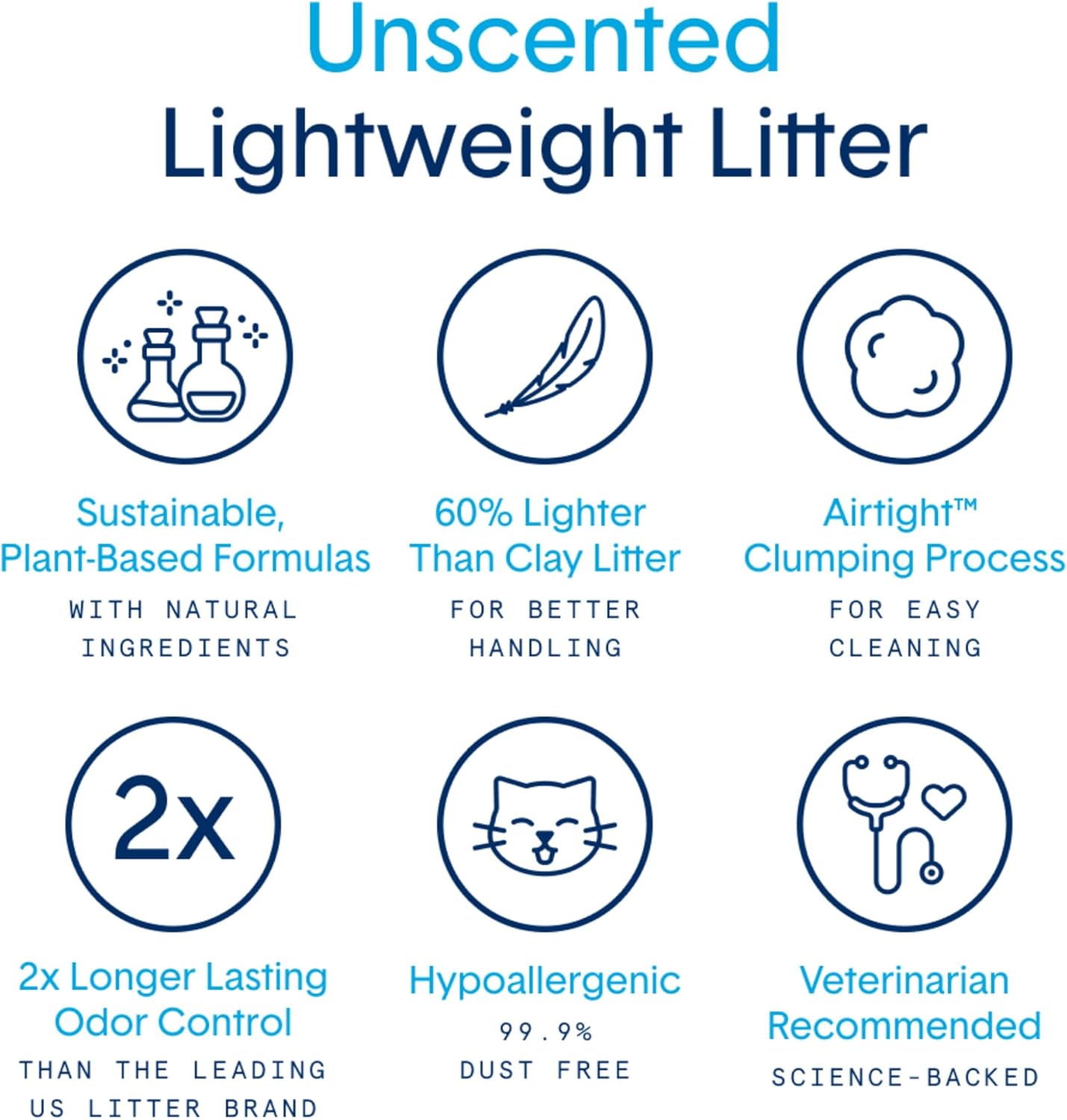 • EASY TO POUR & EASY TO CLEAN: 60% lighter than clay litters, making it easy to lift, pour and store. Clumps form instantly on the top of the litter box, rather than sticking to the sides or bottom. Non-stick for easy scooping & cleaning throughout the month.