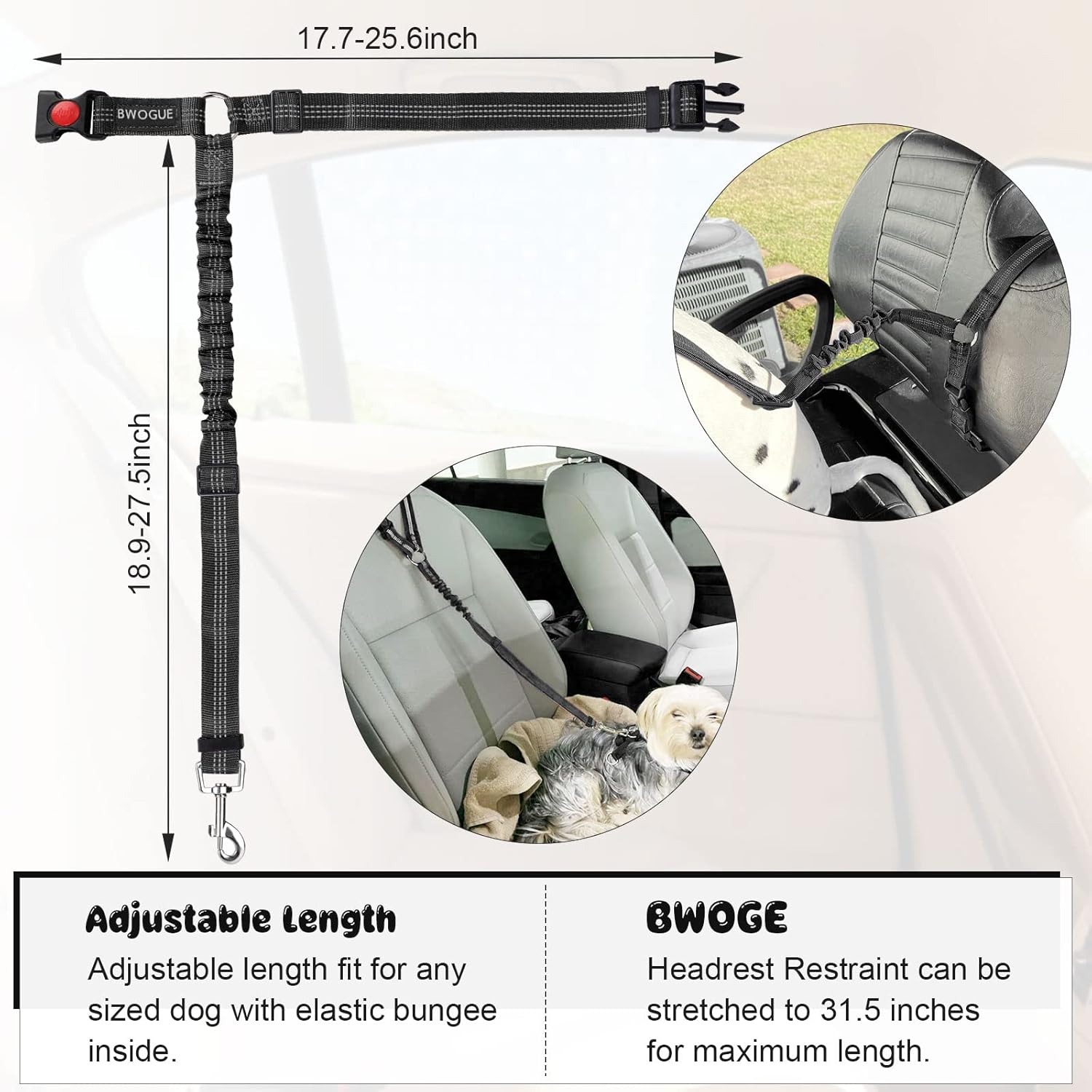 • ADJUSTABLE LENGTH: Dogs come in different sizes and weights. With buckle on the straps and the elastic bungee inside, The BWOGE Headrest Restraint is adjustable between 18.9-27.5 inches and can be stretched to 31.5 inches for the maximum length. The circle can be adjusted from 17.7 inches to 25.6 inches.You can easy to adjust the dog leash to the suitable length to keep your pet in a safety state.