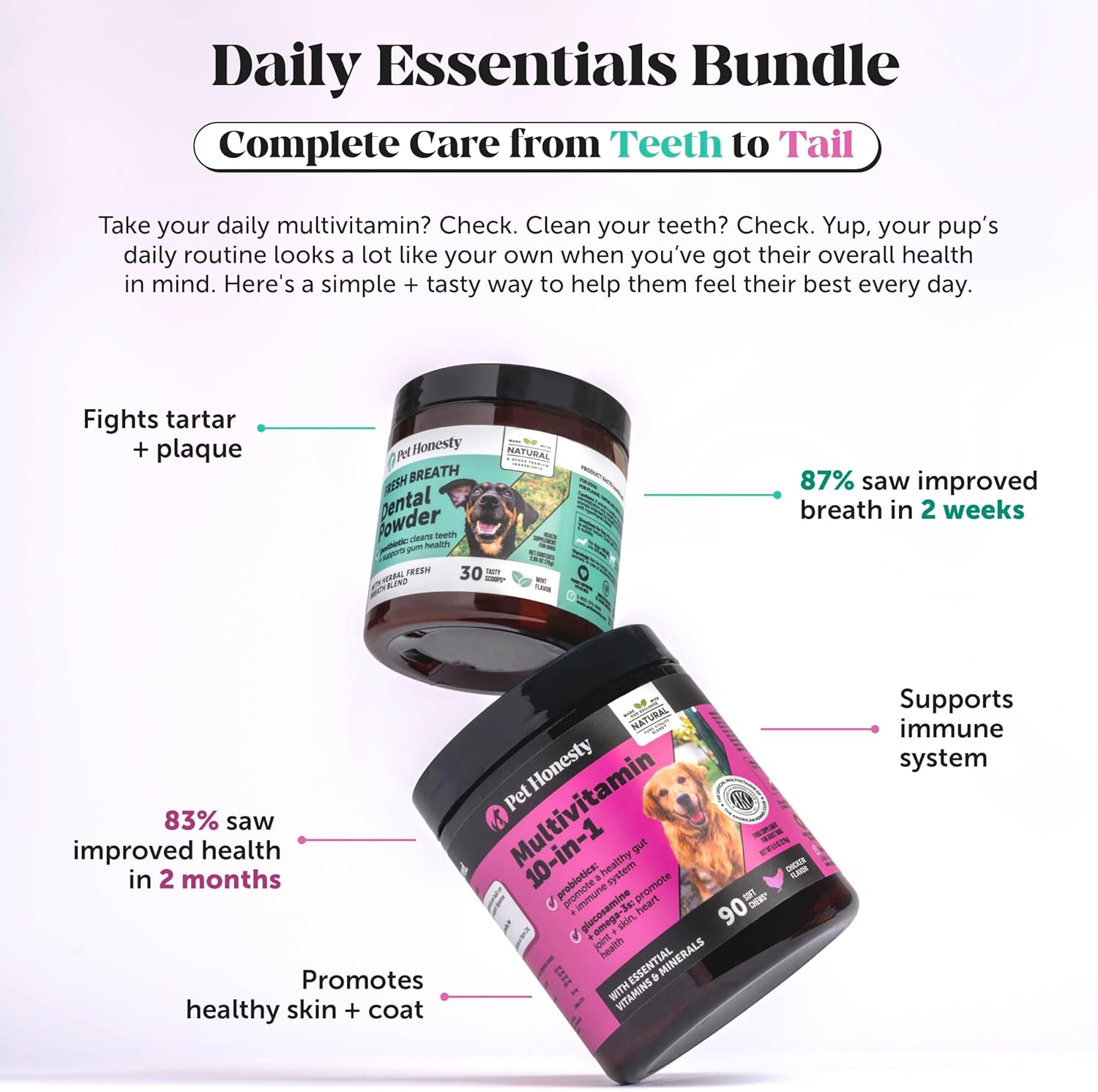 • 10 Benefits in 1 Daily Chew - Our 10 in1 Multivitamin chews combine a well-rounded blend of essential vitamins and supplements for dogs' overall daily health including glucosamine, probiotics, vitamins, and omegas. Vitamins A, C, and D3 have antioxidant properties that help improve your dog's immune system and keep their heart strong and healthy.