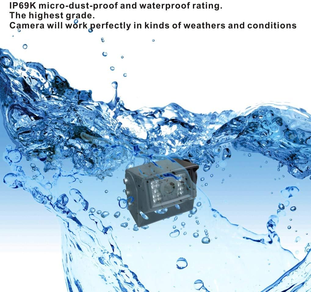 - [HEAVY DUTY CAMERA] It is a color AHD 1080P camera. It provides clear and color image, and no delay. The viewing angle is 120 degree. With waterproof rating IP69K(the highest level) and night vision, it works well in kinds of weathers and low ambient light. With heavy duty 10G vibration-proof rating, it works well with the vehicle which has intensive vibration in extreme conditions.