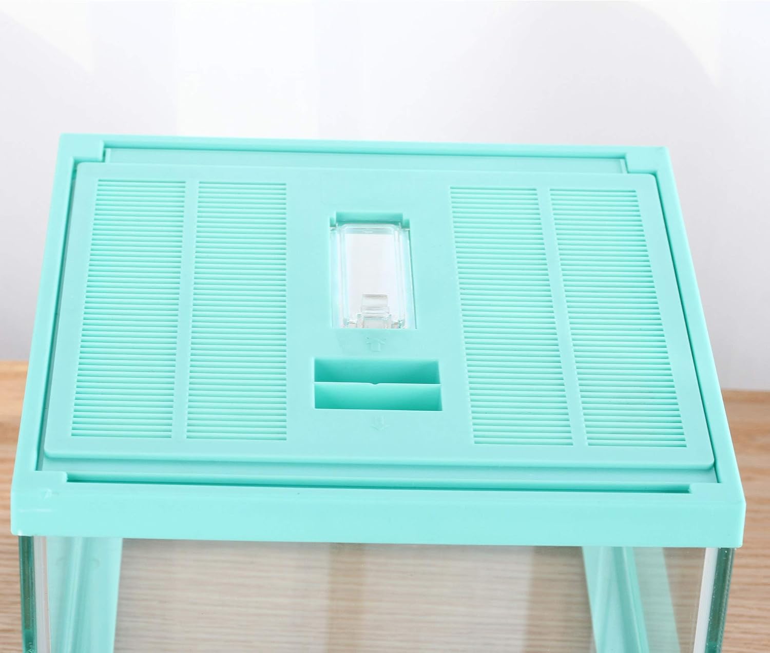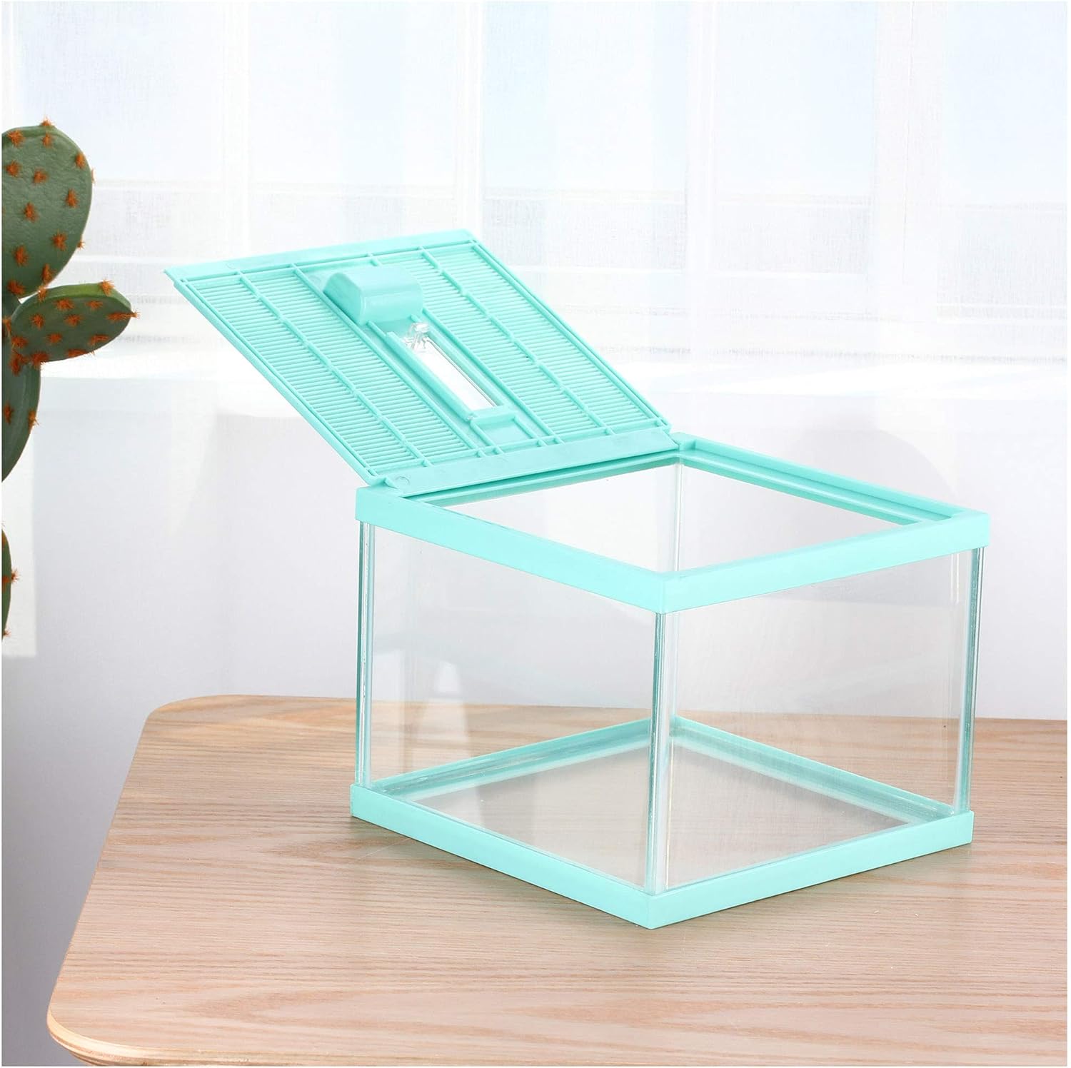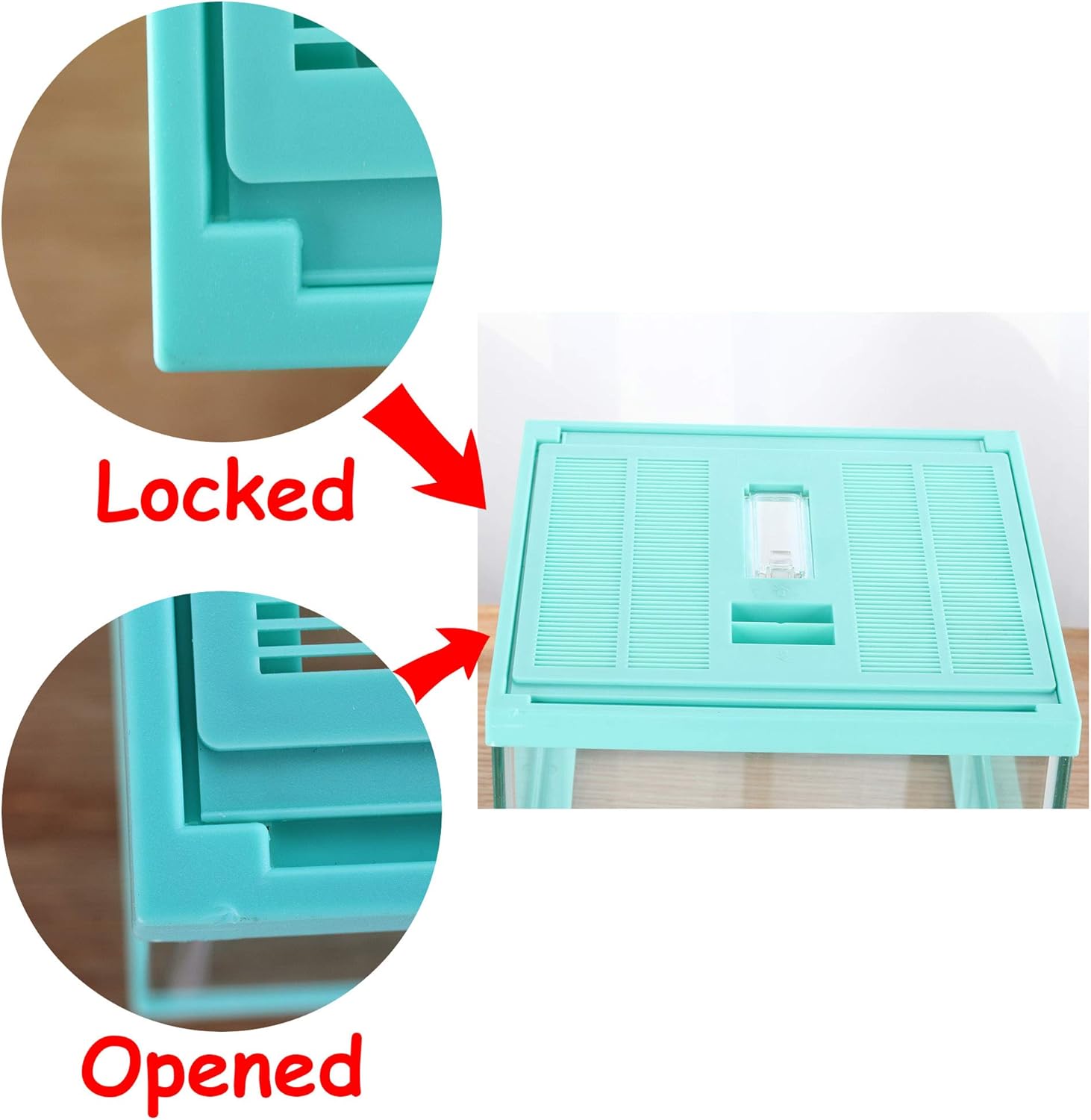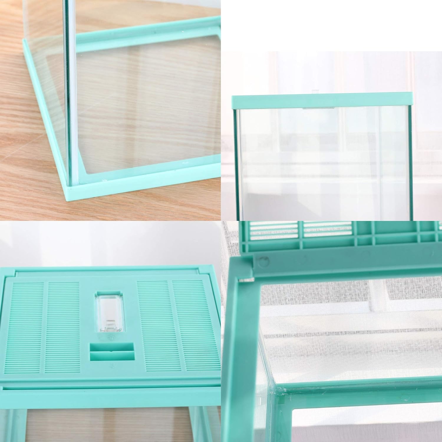 • Glass tank and pale Green cover. Top window ventilation,safe lock prevent escape, a feeding hole