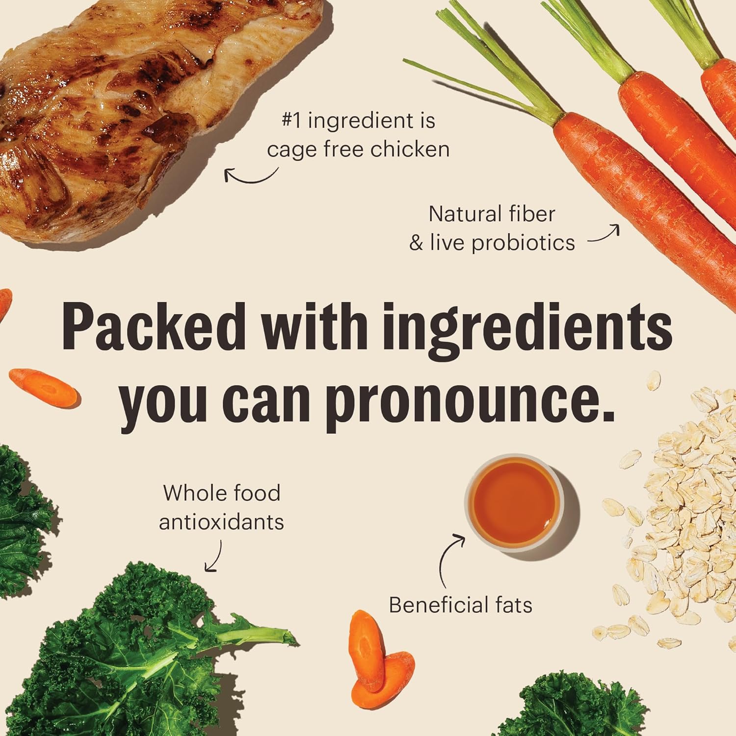 • HUMAN GRADE: High quality, human grade ingredients such as cage-free chicken, oats, & vegetables. Produced to the same standards of quality & safety as the food you eat. Made in the USA with ingredients sourced from suppliers around the world.