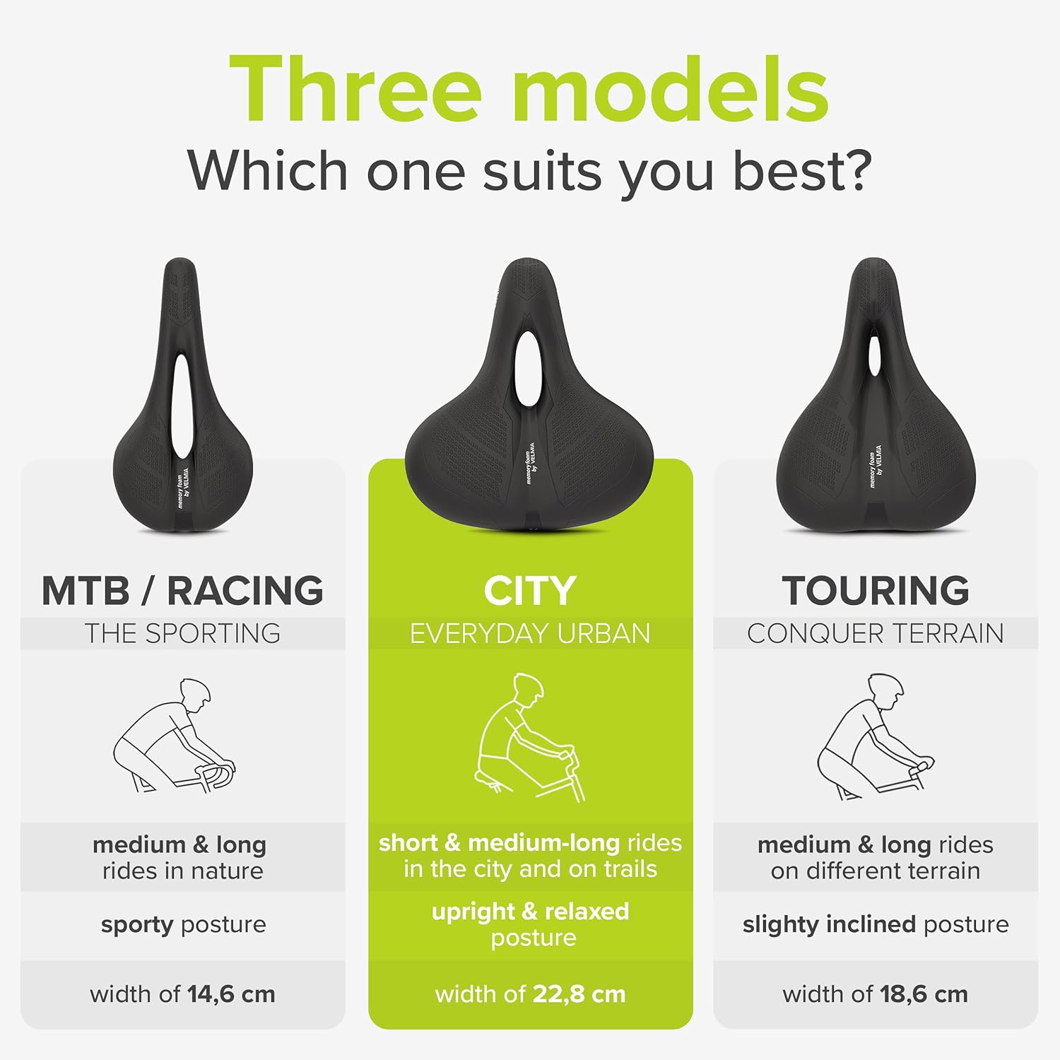• MADE FOR YOUR RIDING POSITION - There are three specific models of the bicycle saddle, so you can choose the Velmia bike seat depending on your individual riding position and riding style needs!