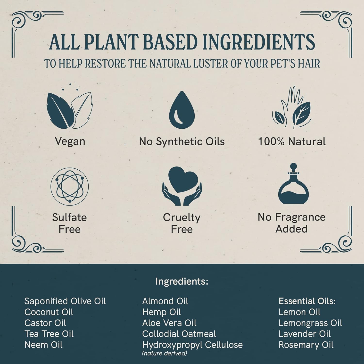 • Powered by Clean, Botanical Ingredients - Made with pet-safe ingredients like Aloe Vera, Almond Oil, Colloidal Oatmeal, and calming essential oils, this non-GMO, gluten free dog shampoo hydrates and refreshes without synthetic additives or harsh ingredients.