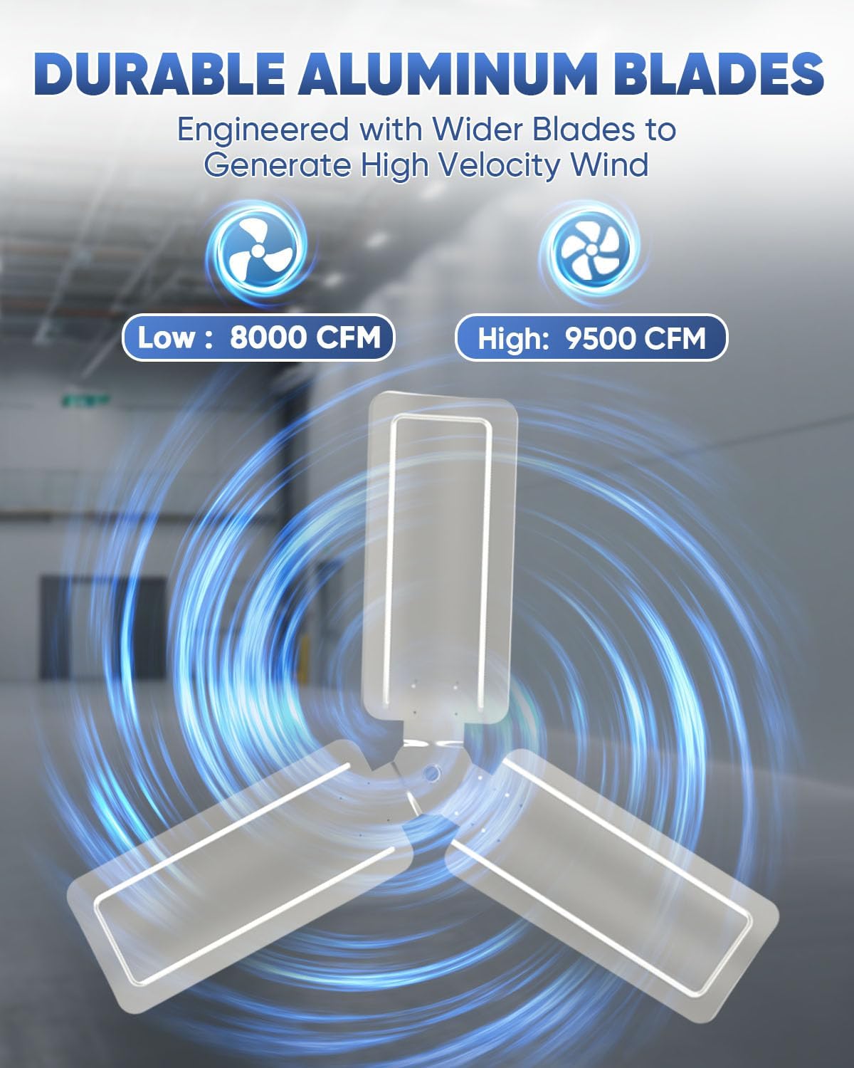 • Superior Airflow Performance. This high-velocity fan delivers up to 7497 CFM on high speed with 2-speed settings. Featuring 90ยฐ oscillation and 60ยฐ vertical tilt, it ensures efficient cooling and wide air circulation for large spaces.