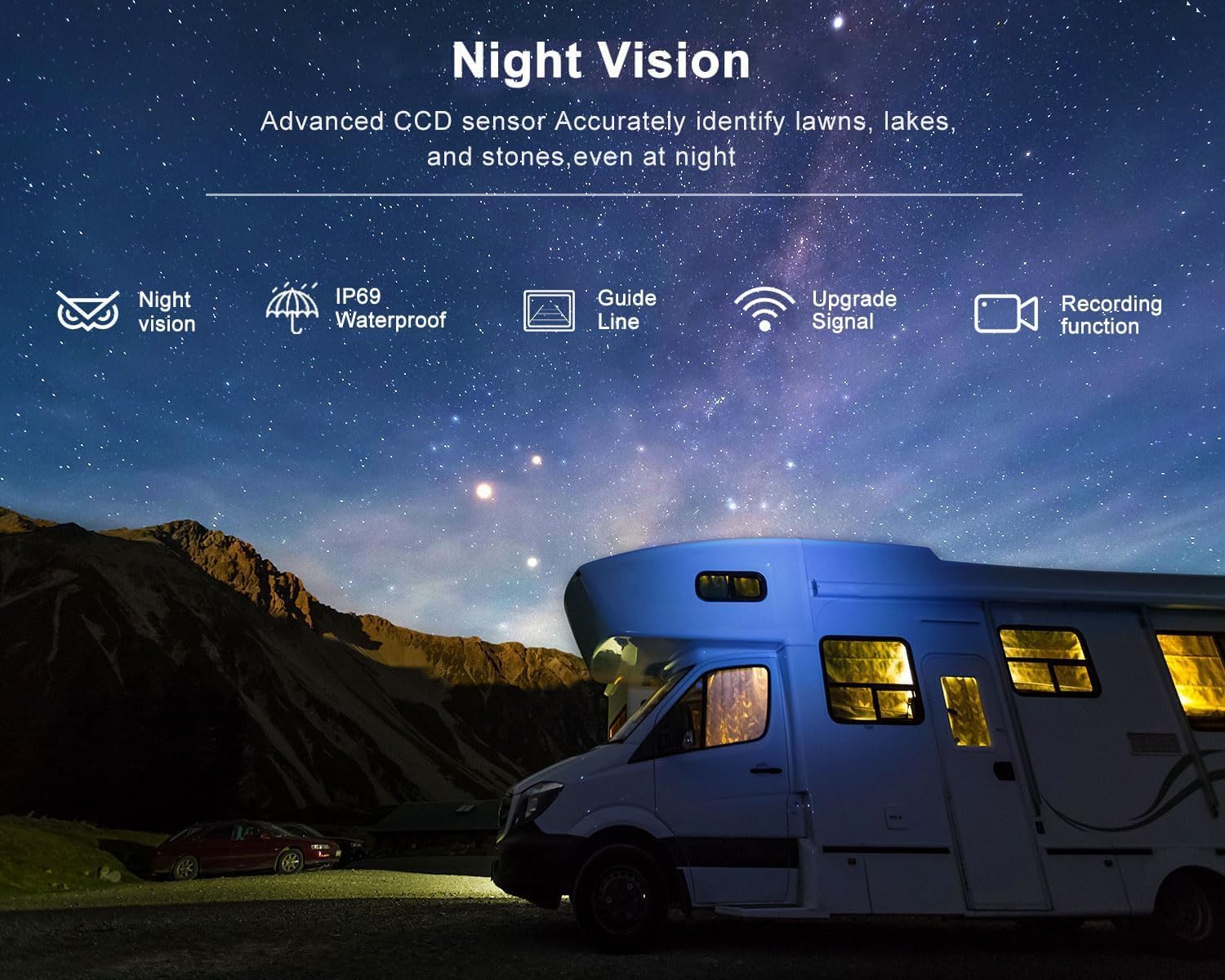 - ๐ใNight Vision & IP69 Waterproofใ Infrared LEDs + CCD sensor detect obstacles in darkness (lawns, curbs, debris) *Clean camera lens periodically for optimal night vision. The IP69-rated metal-sealed housing resists rain, snow, dust, and extreme temps (-4ยฐF to 158ยฐF), provide you all day intimate monitoring.