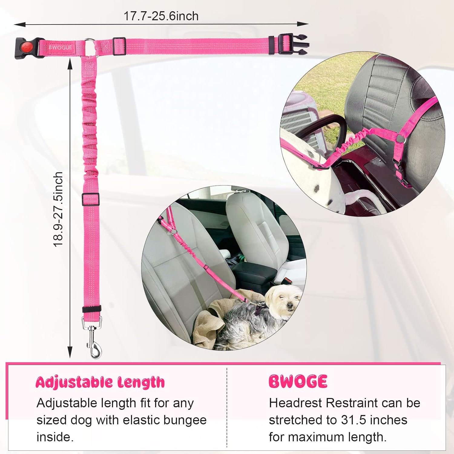 • ADJUSTABLE LENGTH: Dogs come in different sizes and weights. With buckle on the straps and the elastic bungee inside, The BWOGE Headrest Restraint is adjustable between 18.9-27.5 inches and can be stretched to 31.5 inches for the maximum length. The circle can be adjusted from 17.7 inches to 25.6 inches.You can easy to adjust the dog leash to the suitable length to keep your pet in a safety state.