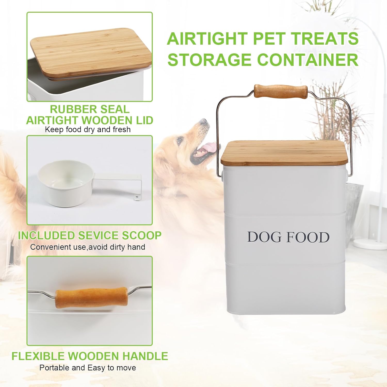 Dog Food storage container Dog Treats Jar,5~6 lb Metal food treats tin for Dog, pet snacks Canisters with wooden lid/handle/sevice scoop-White