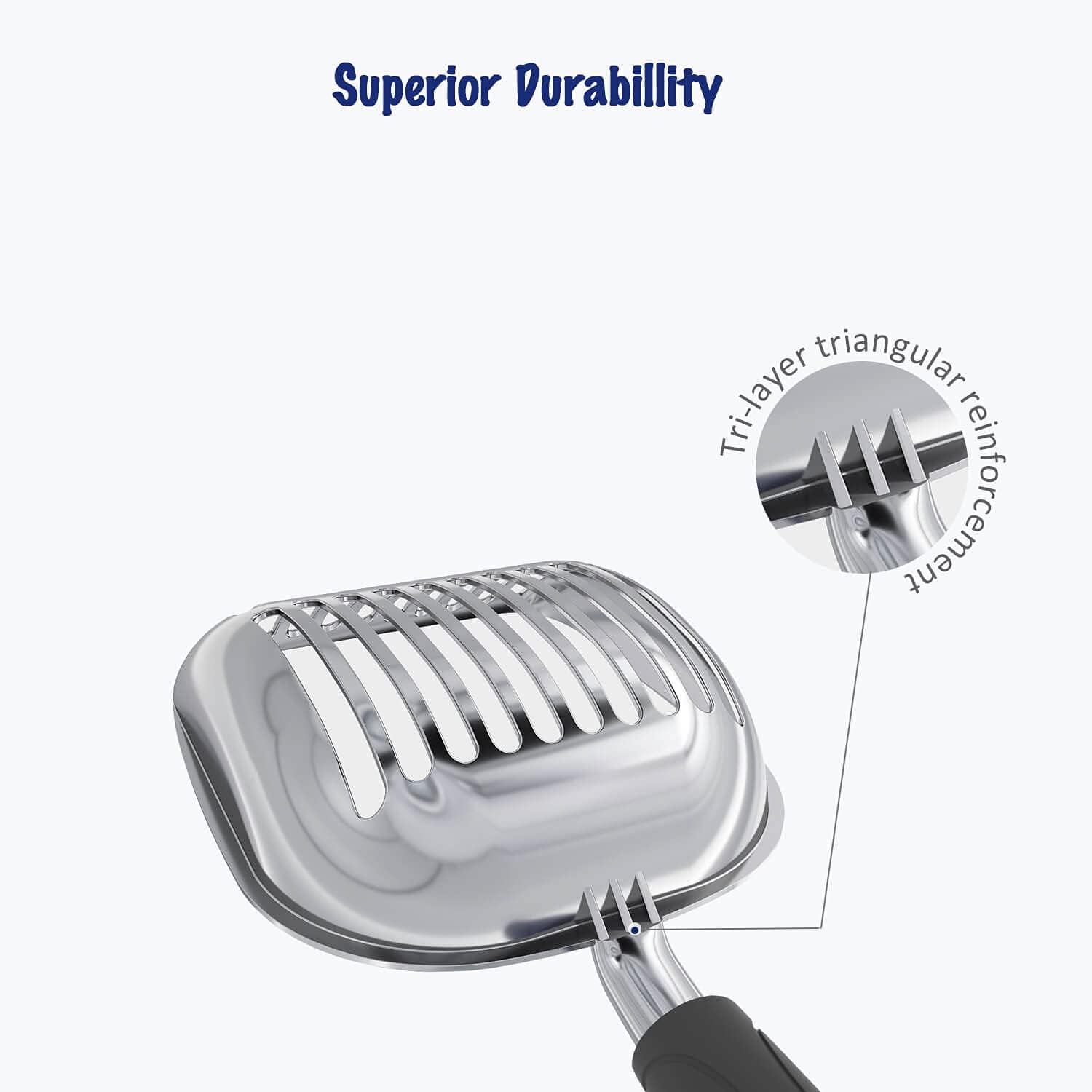 • [Features]: WePet made this scooper durable with heavy duty quality. After investigation with thousands thoughtful users, we finally make an improvement of removing the serrated edge as mentioned on reviews. The body is waterproof and very easy to clean, rust-resistant and corrosion resistant. It’s highly recommended by cat lovers for everyday use.