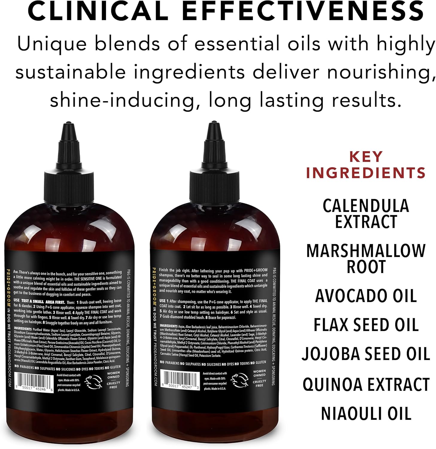 • COATCARE: Each PRIDE+GROOM formula contains unique blend of all-natural essential oils, signature scents and sustainable ingredients for dog’s specific coat + skin types that provide healing, hydrating, cleansing, nourishing and beautifying benefits.