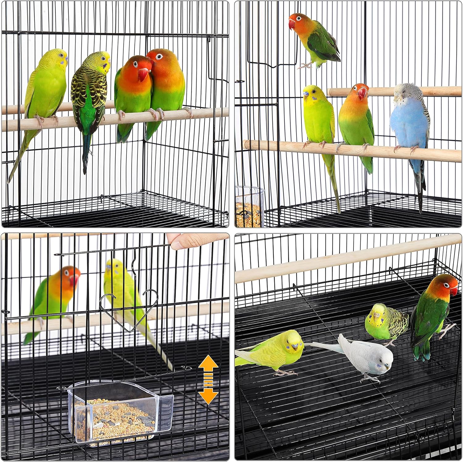 • Safety door design: The main door can be opened in two ways for you to take in or out different things, and you can use two supplementary doors for changing seeds and water without your parrots sneaking out unexpectedly