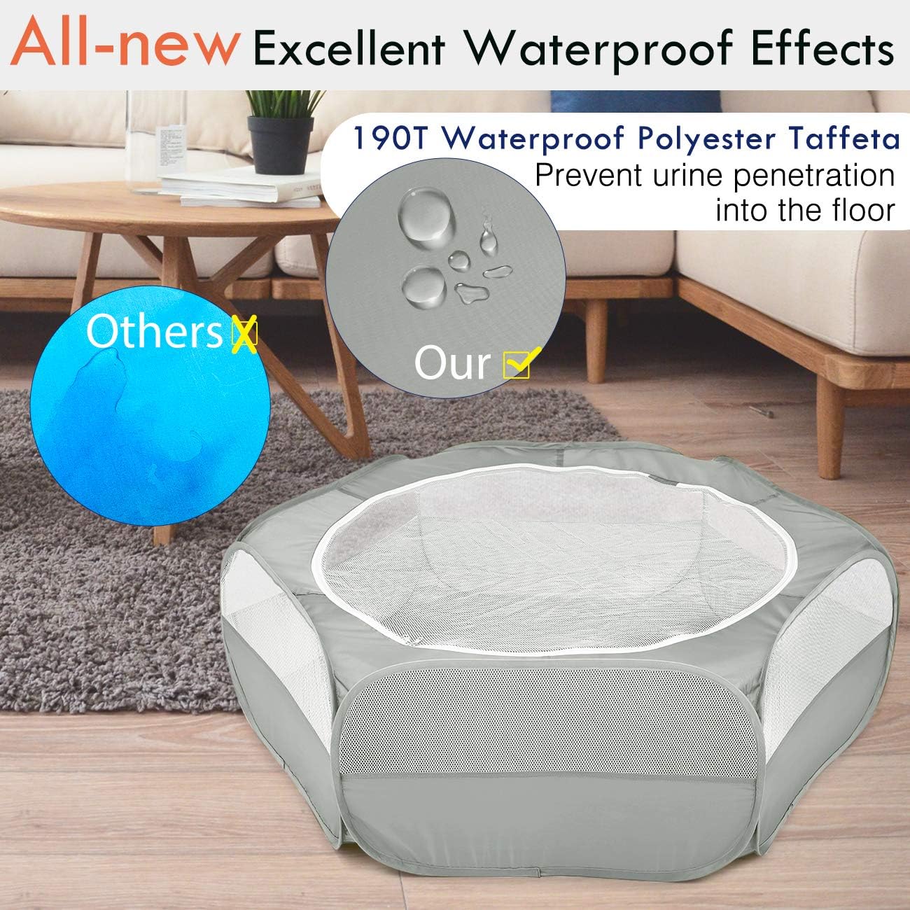 • ใ€ NO MESS - WATERPROOF DESIGN ใ€‘๏ผš190T Waterproof Polyester Taffeta with the bottom of the playpen, effectively prevents urine penetration into the floor. The top mesh with a dual-zippered opening is easy to clean and allows power cords to pass through. (NOTE: For your small pet animals' health, please clean up the water stain in time.)