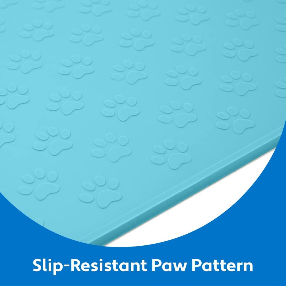 • SLIP RESISTANT TOPSIDE: raised paw pattern on topside helps keep bowls from sliding, while also preventing food, crumbs and water from reaching your floors