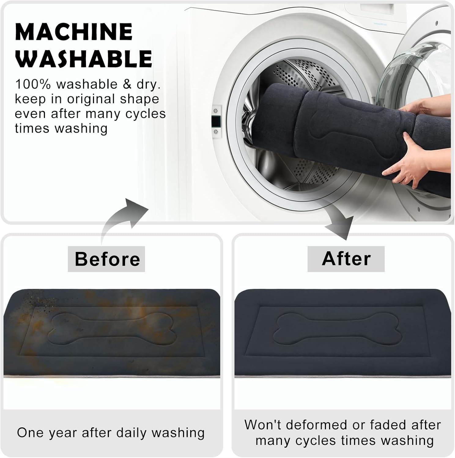 • 100% Washable Dog Crate Bed: Fabric fleece material mats allow both machine and hand wash in cold water, gentle cycle and tumble dry. The crate mat will recover original shape after many times cycles of washing.