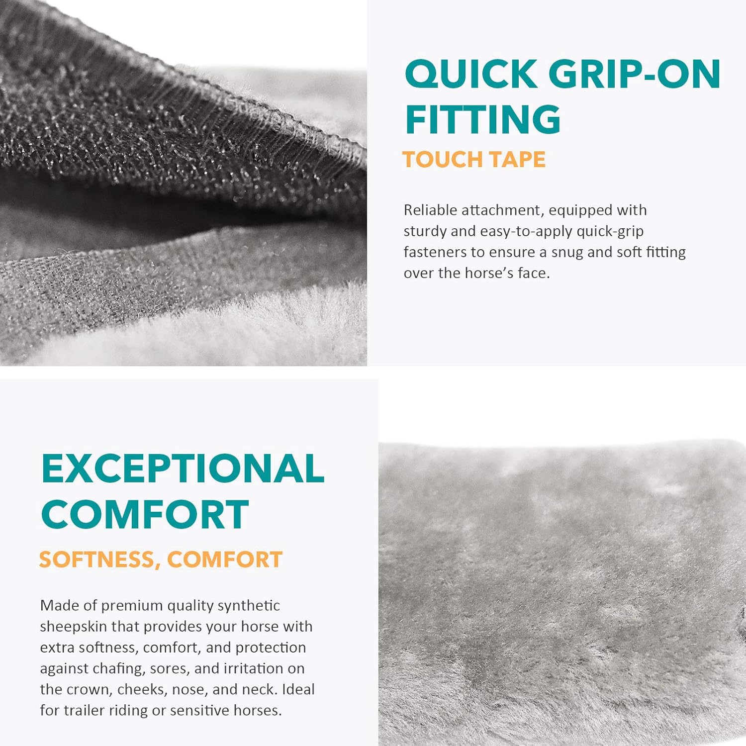• QUICK GRIP-ON FITTING: Reliable attachment, equipped with sturdy and easy-to-apply quick-grip fasteners to ensure a snug and soft fitting over the horse’s face.
