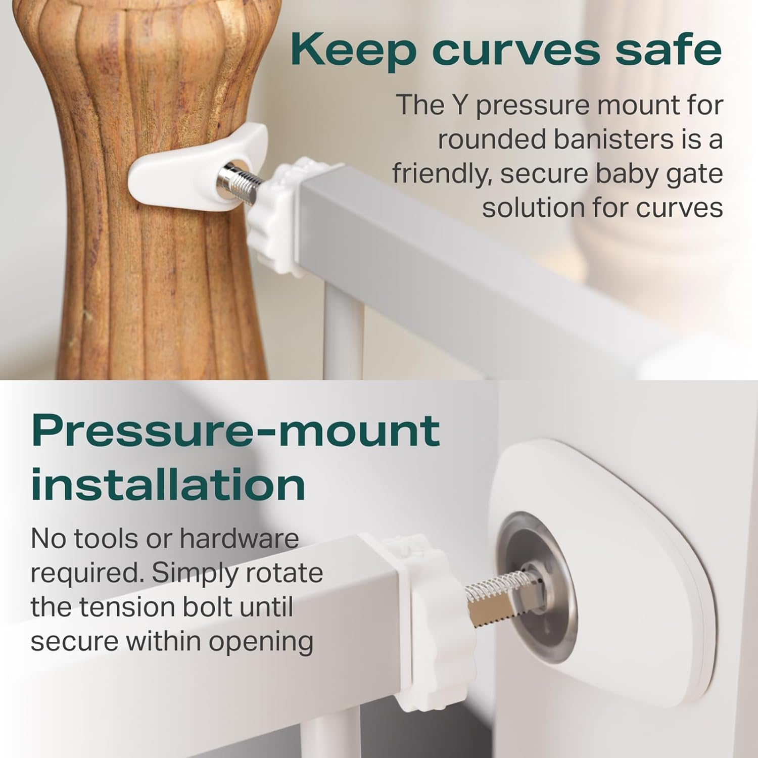 • Easy Installation โ€“ The simple pressure-mount system is easy enough for anyone to install in just 10 minutes. Itโ€™s perfect for stairs, hallways, doorways, and open spaces. Make sure the installation distance between the upper and lower walls is within 29.7 to 46 inches. (Note: Works with both flat and baseboard walls.)