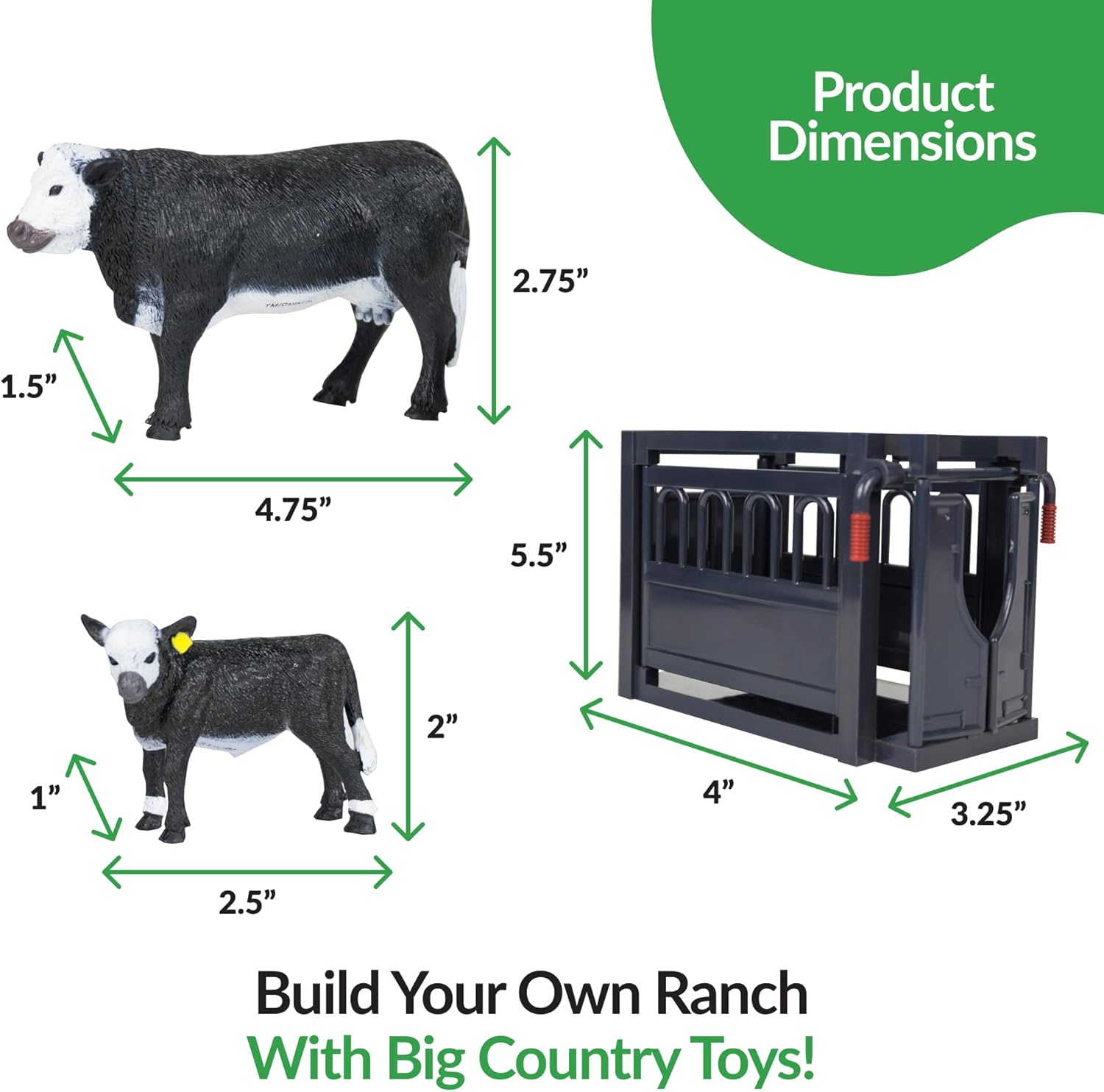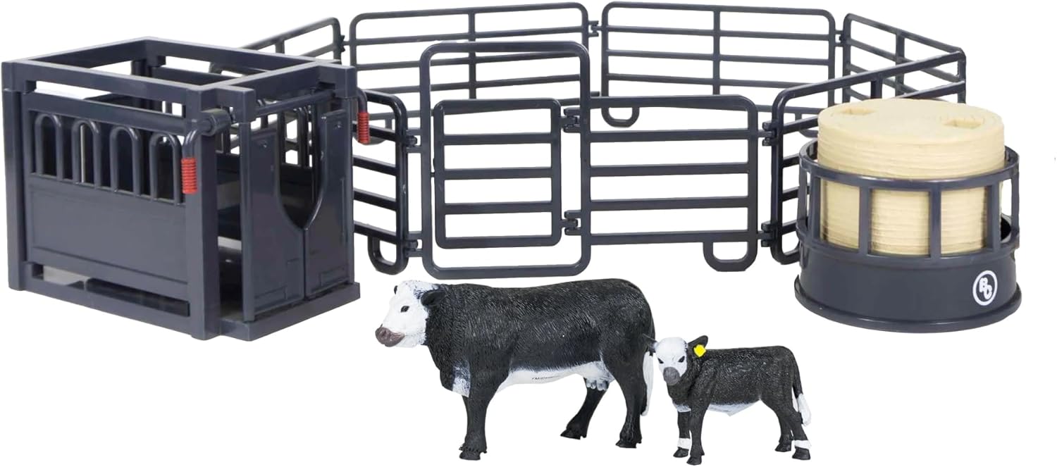 • Durable 12-Piece Farm Playset: Made of our proprietary blend of child-safe plastic that creates durable, lifelike farm animal toys for kids 3-5 years and up. Inside this play figure playset, you'll find farm animal figurines and other accessories like 7-piece corral fencing, a cattle squeeze chute, a toy black baldy cow and calf pair, a toy hay bale, and a toy hay ring.