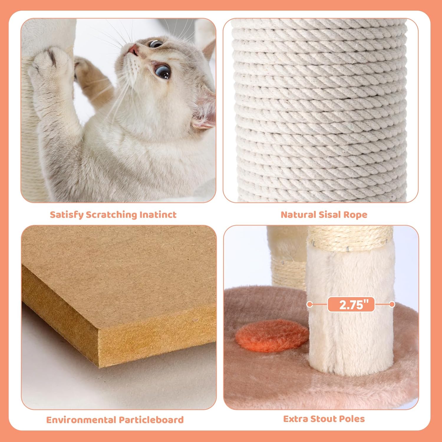 • Premium Eco-Friendly Materials:Made with CARB-certified P2 grade particleboard and 400g skin-friendly plush for comfort. Features 9-core 6mm sisal-wrapped posts, more durable than regular sisal, to satisfy your cat's scratching instincts and protect your furniture. This cat tree is perfect for scratching, climbing, and exercising.
