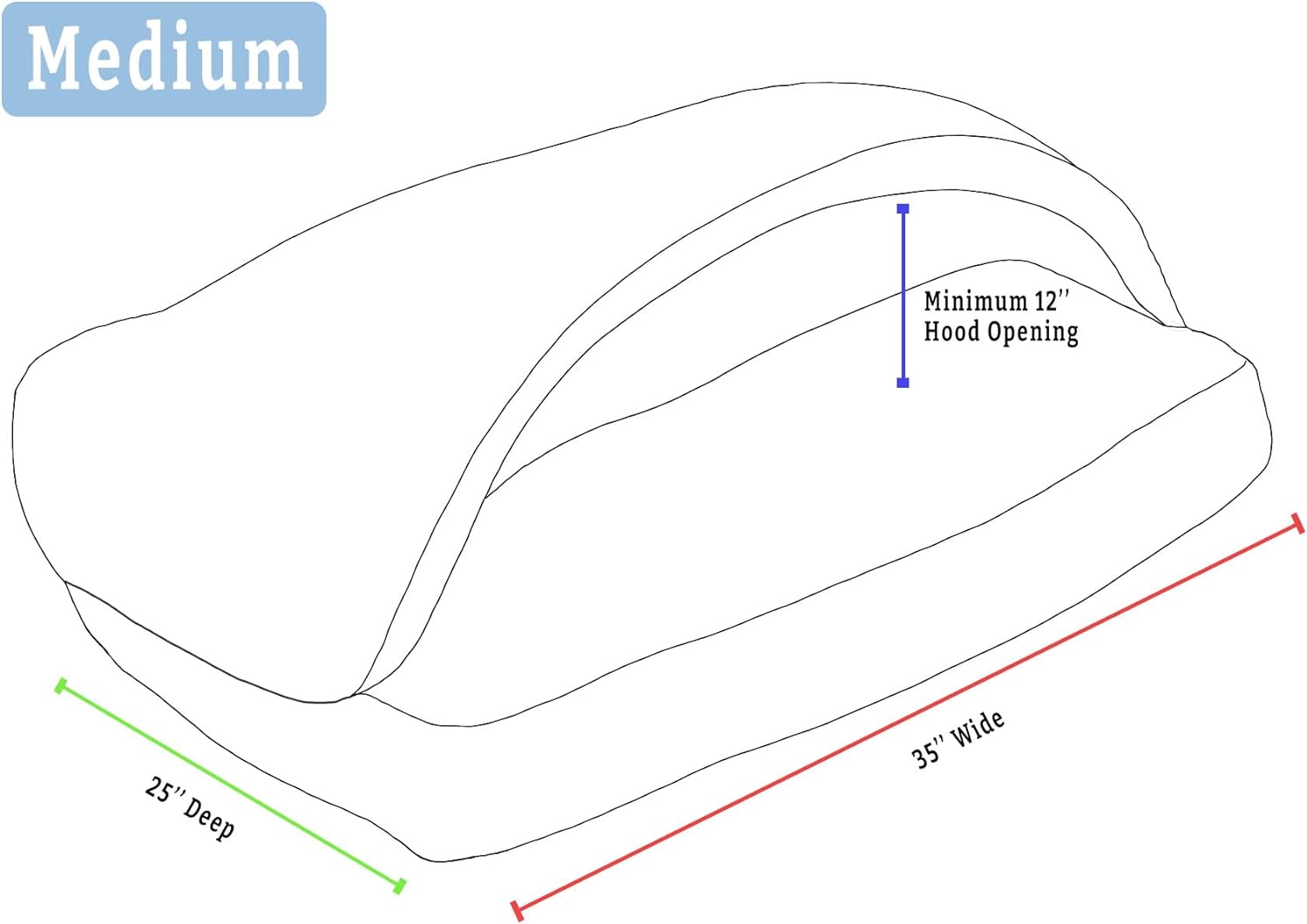 • Sizing: This dog bed measures 25" deep by 35" wide with a 4" sidewall, and about 8" total height with the hood, perfect for medium sized dogs. Includes a removable plastic tube to keep the hood open