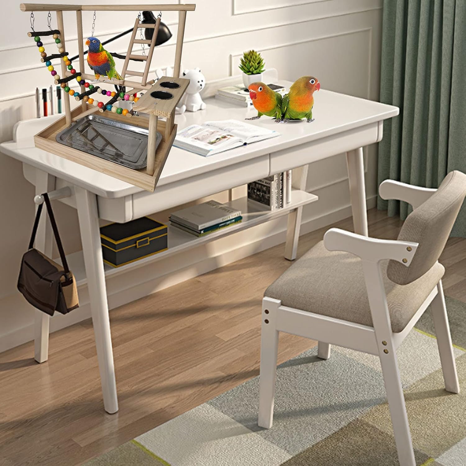- PERFECT SIZE: The size of Hamiledyi parakeet play stand is 14.5"L x 9.8"W x 15.7"H (37 x 25 x 40 cm), birdcage play stand the great portable size is suitable for placing on the desk. Brightly colored toys appeal to the birdโs strong eyesight capabilities. When kept as pets parrots need time outside of their cage to play, to exercise and to interact with their human companions