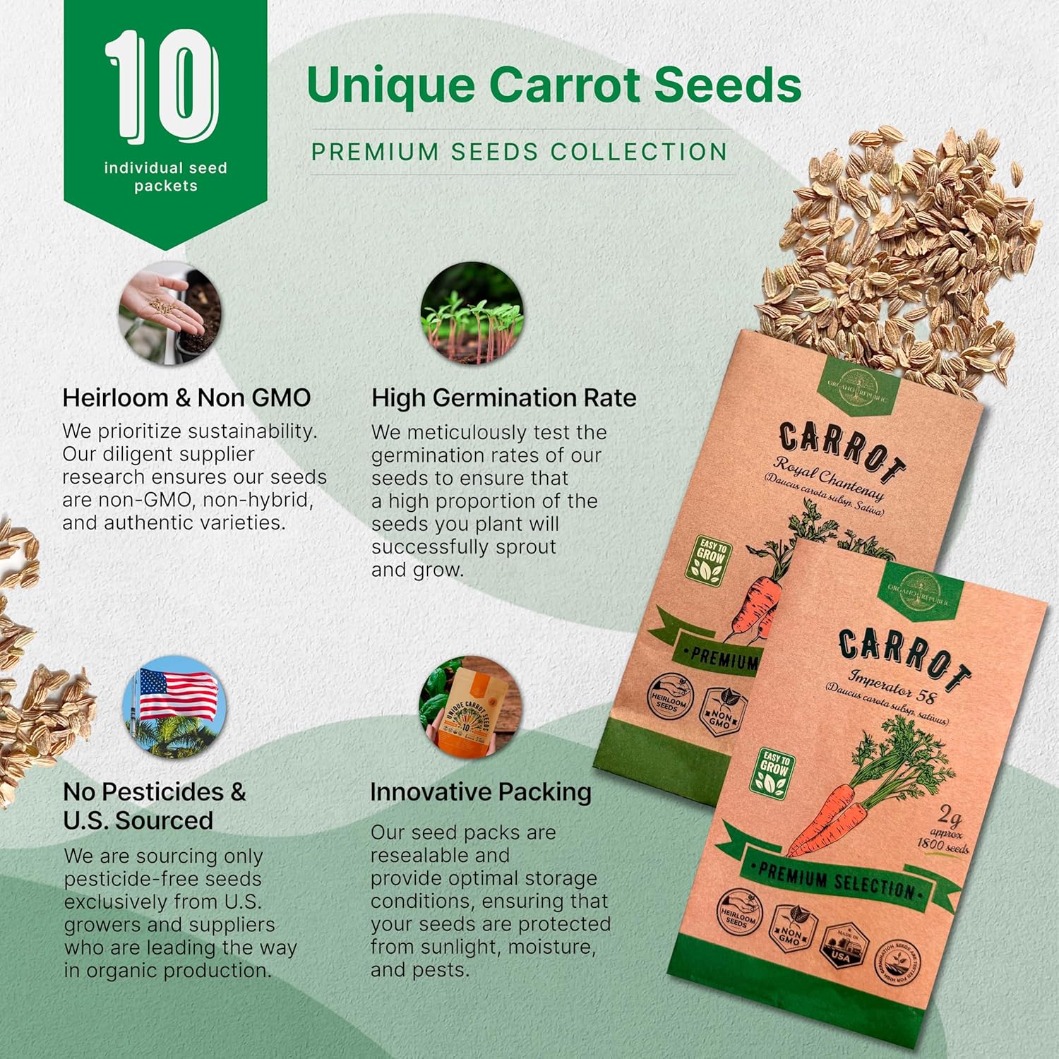 Organo Republic 10 Unique Carrot Seeds Variety Pack - 7,550+ Non-GMO Heirloom Carrot Seeds for Outdoor & Indoor Home Gardening, Including Carrot Imperator 58, Little Fingers, Scarlet Nantes, Parisian