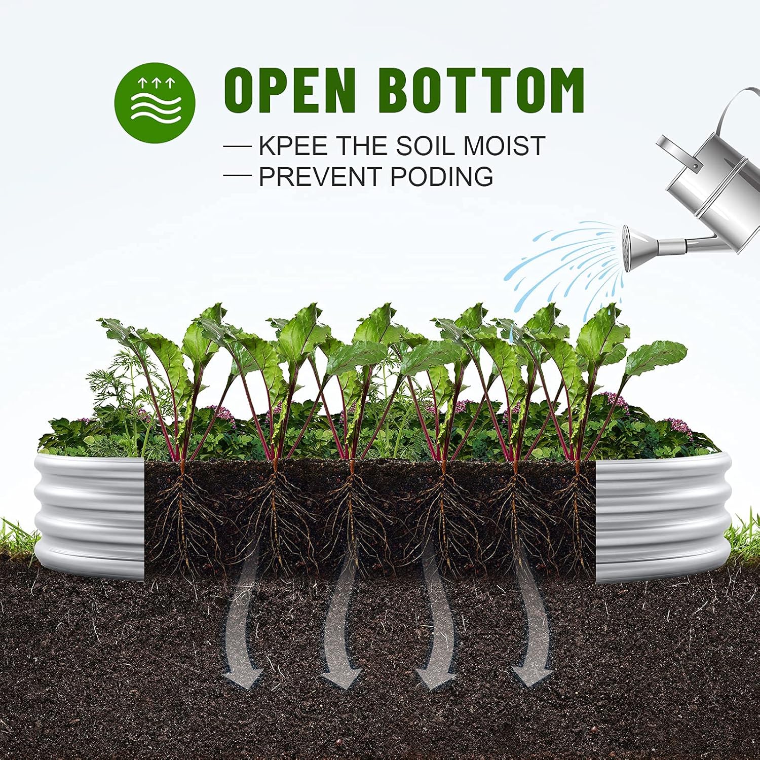 • Open base: This galvanized raised garden beds for vegetables large metal planter box is designed with an open base, which can effectively avoid water accumulation and decay, protect the roots of plants, and allow the roots to better absorb nutrients