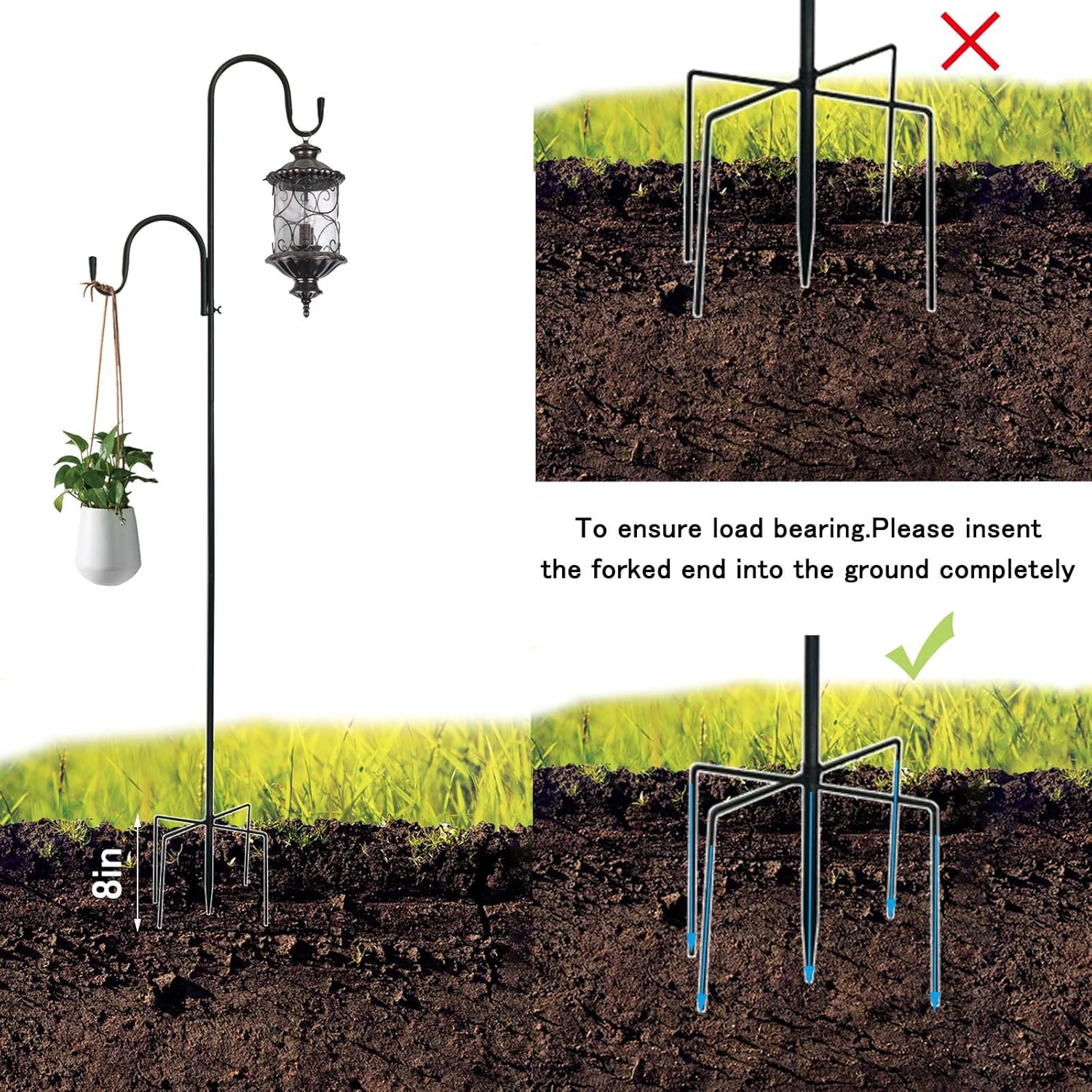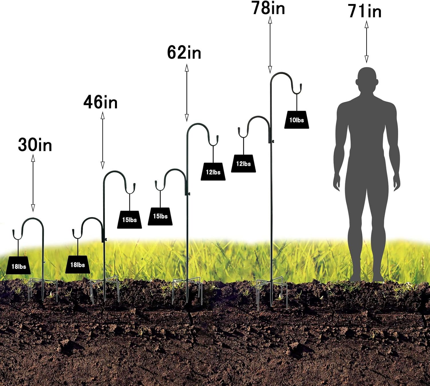 • 【STURDY & DURABLE】 With a 3/4 inch diameter wrought iron metal garden hanging hooks, At a height of 30", each hook is suitable weight that no more than 15lbs; 46" in height fits no more than 12lbs;62" in height fits no more than 10lbs;78"in height fits no more than 8lbs.(NO OVERLOADING) Tip: On both hooks Hanging items makes it easier to balance.The 5 base prongs must all be plugged into the lawn to be provide better stability.
