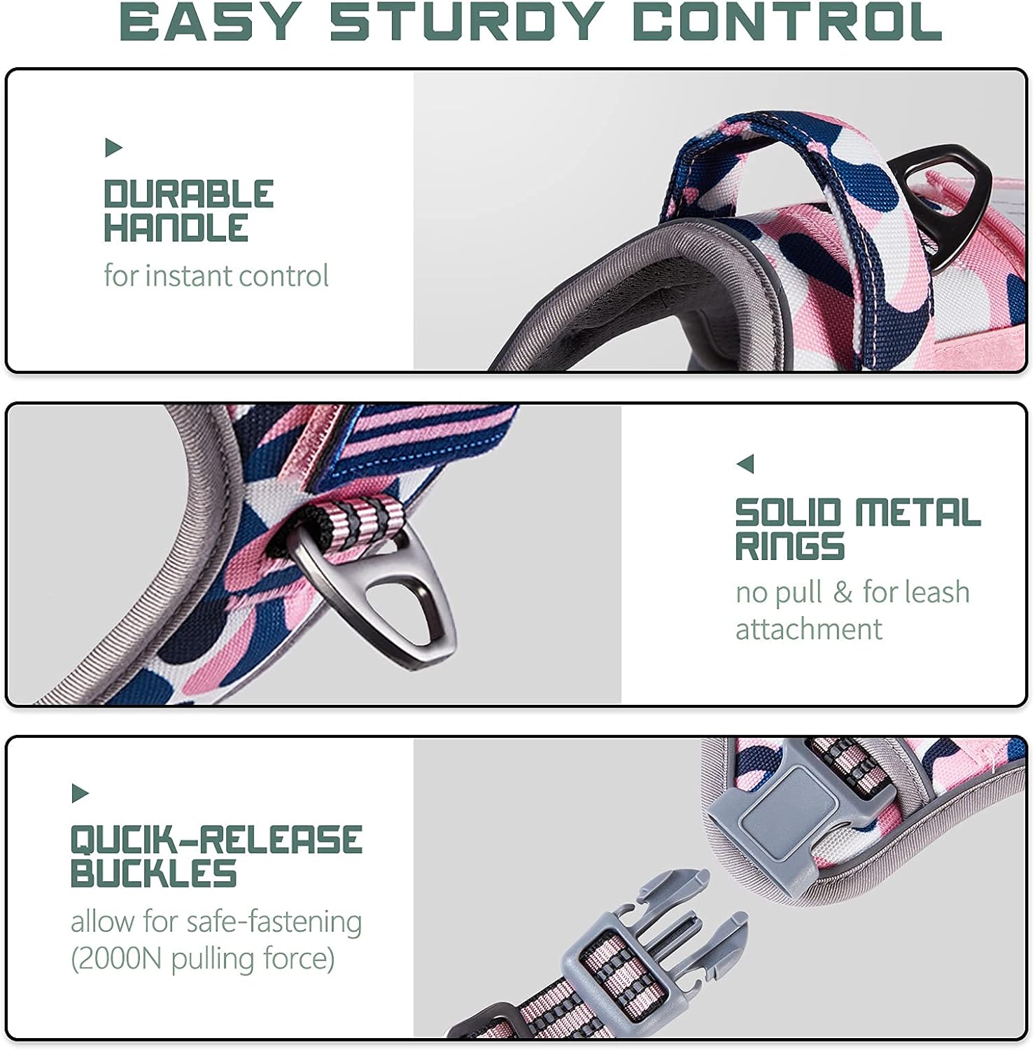 - ๐พNO PULL & STURDY BUCKLES: Provide better dog harness for dogs.๐พ Bumbin dog harness is equipped with 2 Sturdy Metal D-Rings for connecting the leash, reinforced on the extensional part. One Front Clip for No Pull control or dog training. One Back Clip for casual walking or jogging. Our plastic buckles withstand 2000N pulling force to ensure it won't be easily damaged. Recommended Large Dogs, such as Shepherd, Newfoundland, Doberman, Labrador, Alaska, German Shepherd, Large Bulldog, etc.