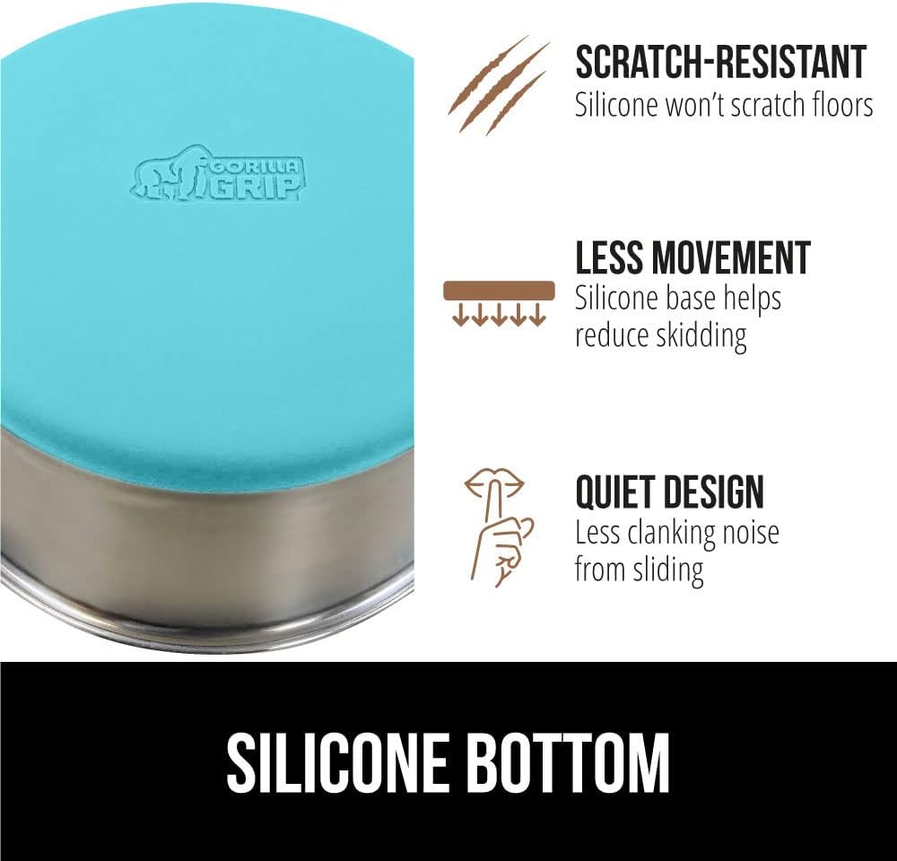 • SILICONE BOTTOM: the Gorilla Grip bowl is constructed from durable silicone that helps keep the bowl steady and wonโ€™t scratch your floors; while some over eager eaters may still be able to slide the bowls, the silicone will help prevent much movement; plus, it reduces the noise from clanking and sliding across wood, tile, and more