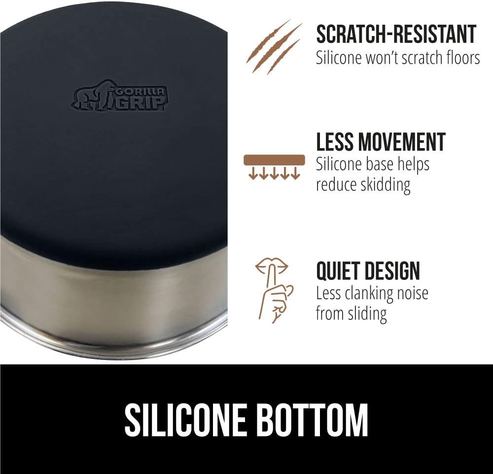 • SILICONE BOTTOM: the Gorilla Grip bowl is constructed from durable silicone that helps keep the bowl steady and wonโ€™t scratch your floors; while some over eager eaters may still be able to slide the bowls, the silicone will help prevent much movement; plus, it reduces the noise from clanking and sliding across wood, tile, and more