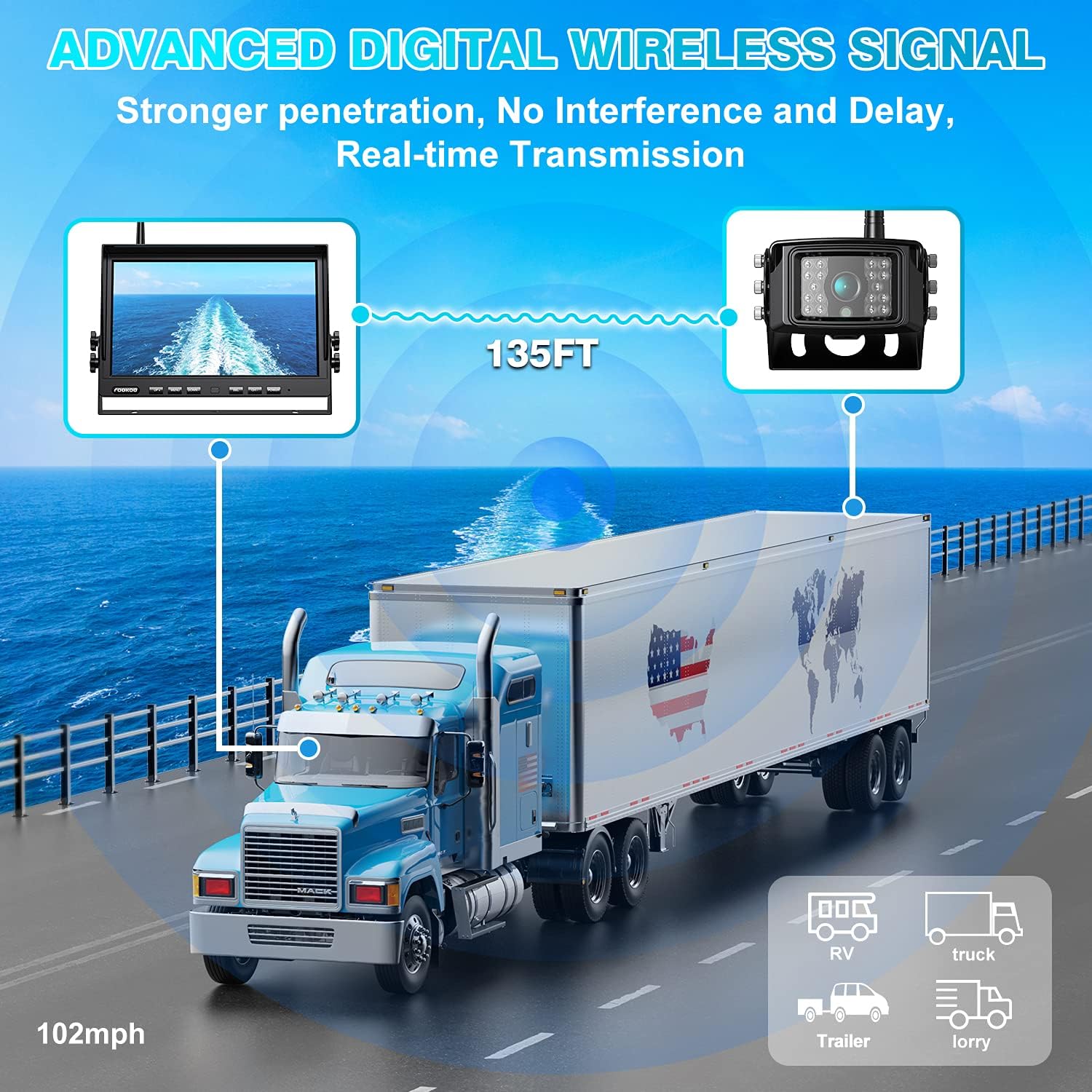 - ใAdvanced Digital Wireless SignalใThe system with stable digital signal works flawlessly within 128ft range in open area, enough for any large vehicles. Even at the high speed of 102 mph, the monitor will display the surroundings in real time, making your driving more convenient. There is no interference, flicker, blurring or delay.
