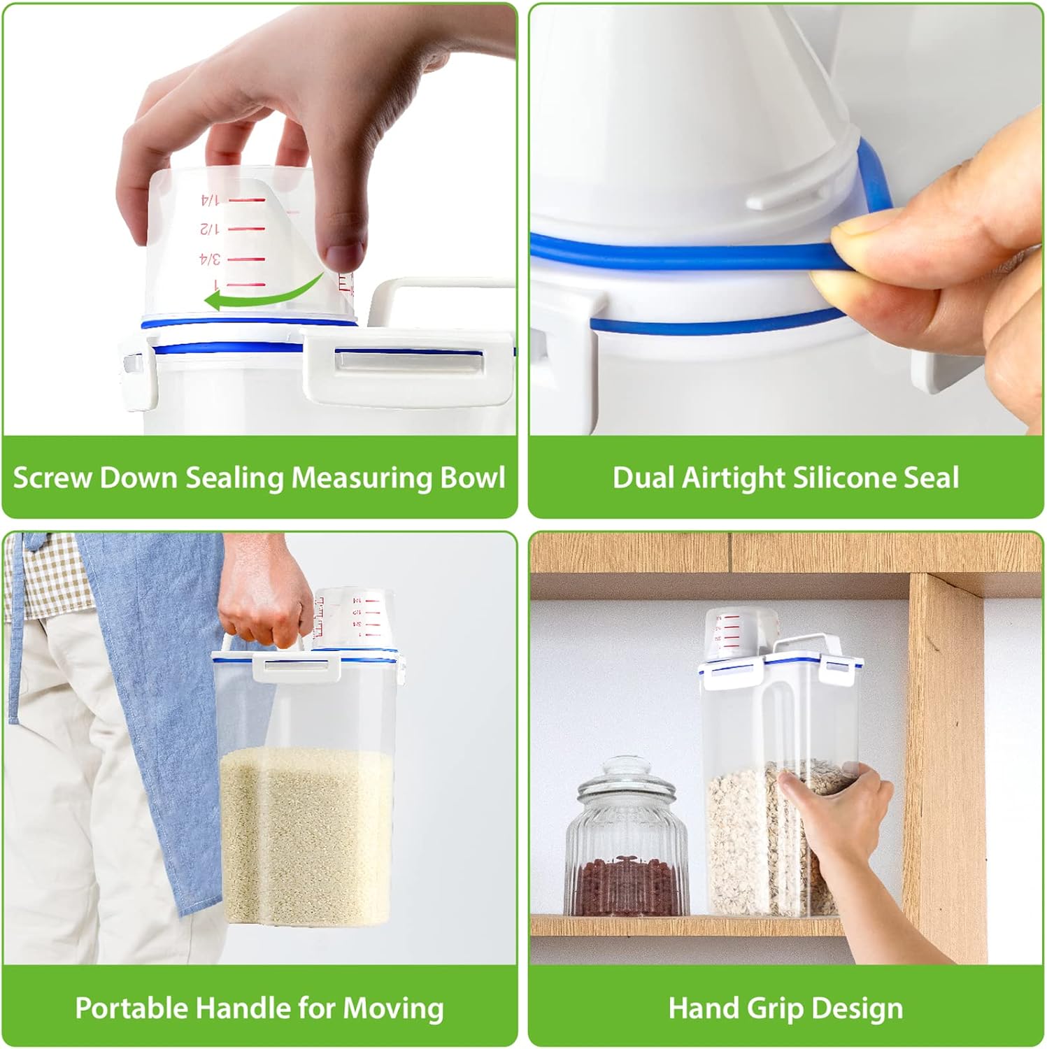 • AIRTIGHT& SPACE-SAVING: the airtight rice storage container will always protect your food from moisture. Four Strong Buckles seal the oatmeal container tightly, keep your food fresh and dry. The pantry rice containers with slim size and moderate height perfect for different size kitchen cabinets