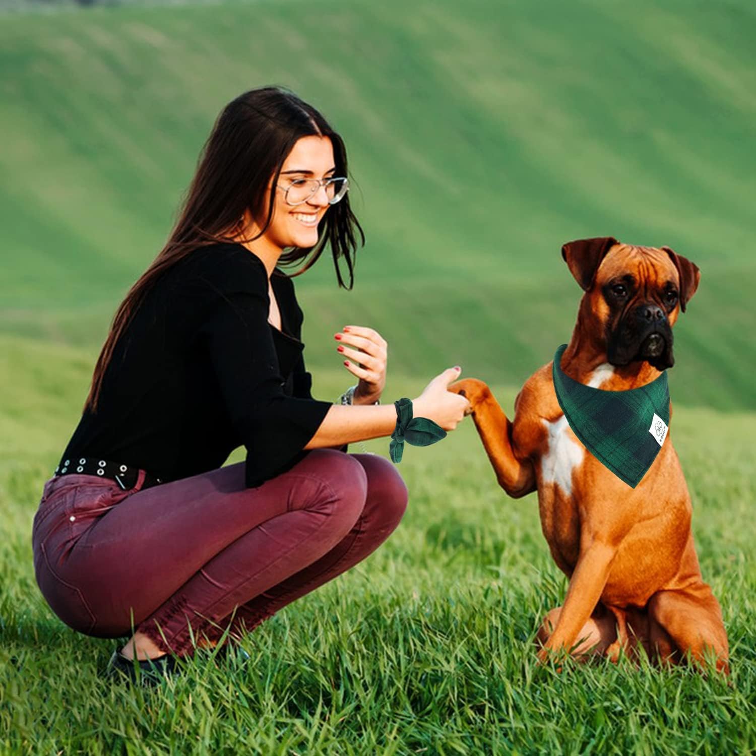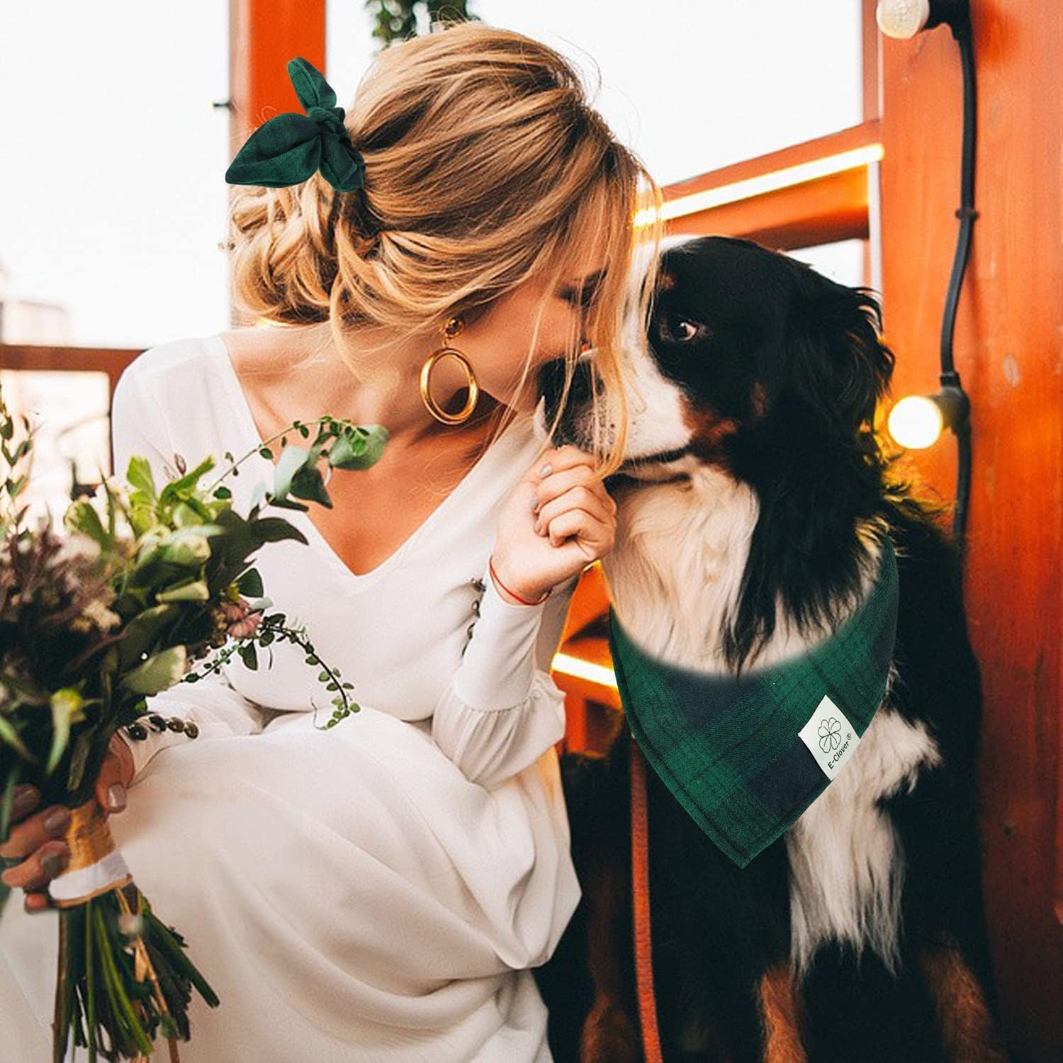 E-Clover Summer Dog Bandanas Boy & Matching Scrunchie Set Plaid Dog Bibs Scarf Triangle Kerchief Bandana for Medium Large Dogs Birthday Gifts Pet Owner Mom Green