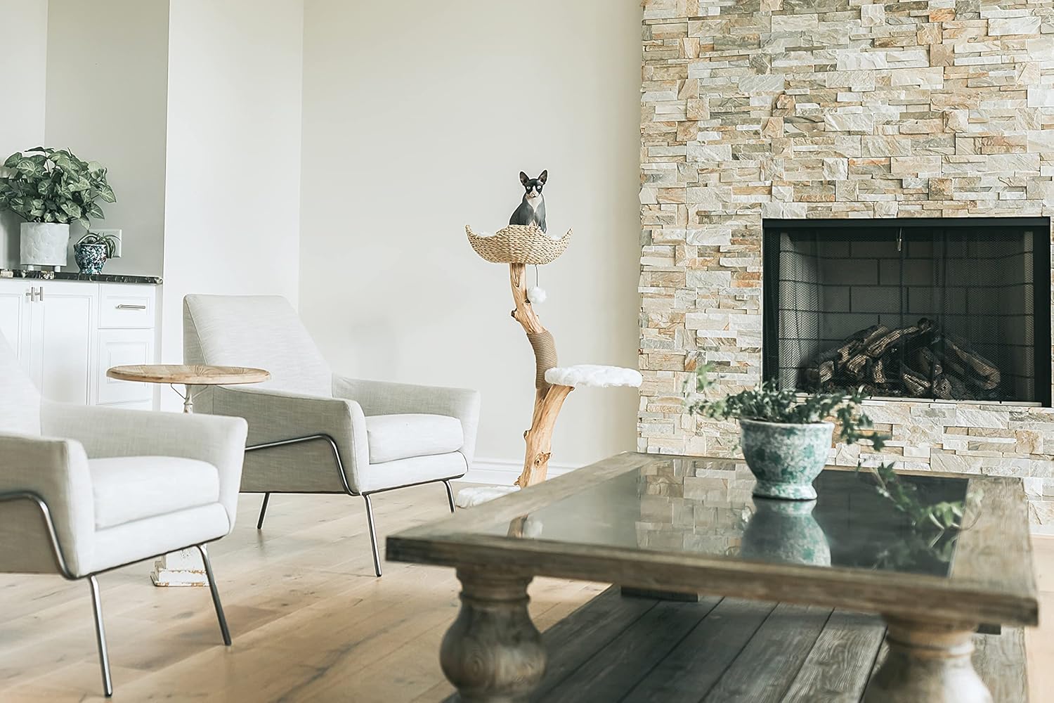 - BEAUTIFUL & UNIQUE DESIGN: Unlike most cat furniture, this wood and wicker cat tree tower will enhance the look of your home and provide a comfy place for kitties up to 15 Pounds to lounge in. It includes a beautifully crafted, one-of-a-kind trunk that holds both a hand-woven wicker basket (with machine washable cushion included) and a cushioned platform step. It's perfect for your kitty to nap happily while you can enjoy looking at a beautiful piece of art that adds to your home's aesthetics.