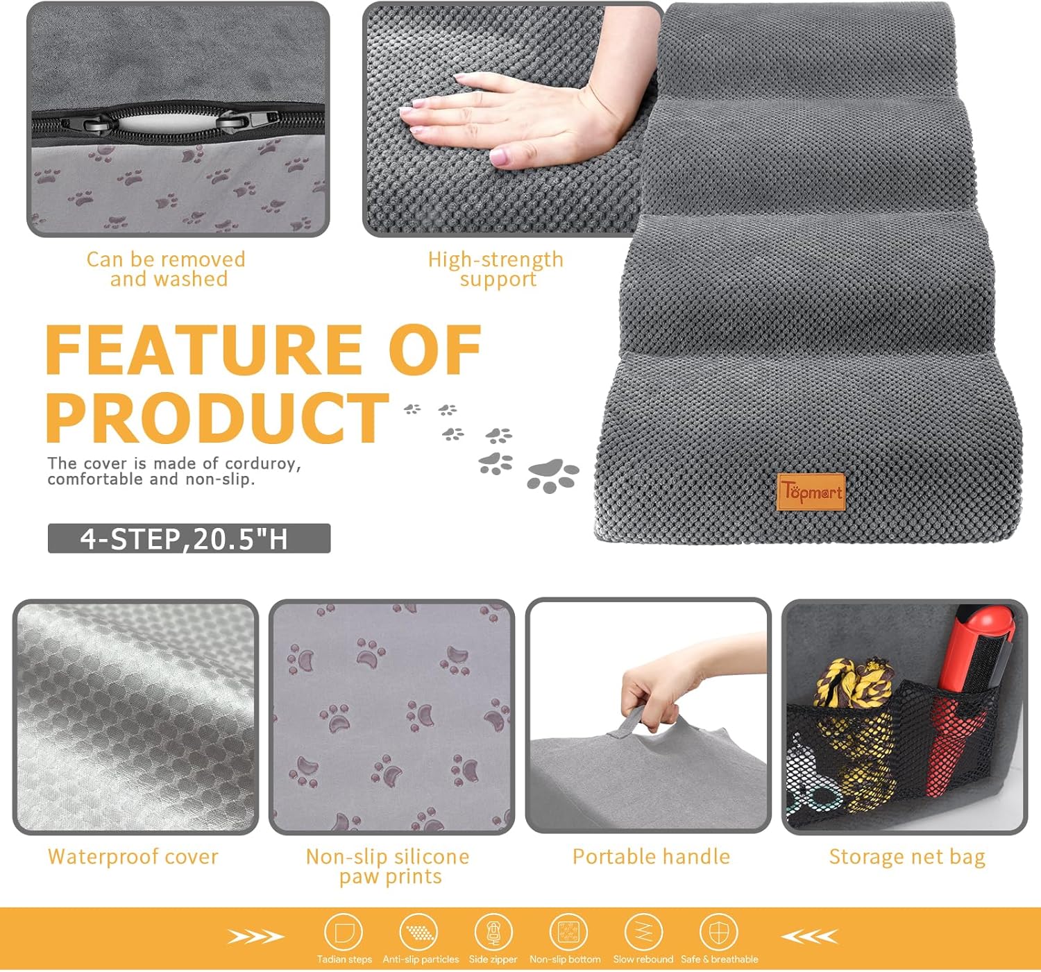 • Safer,Wider&Deeper Steps:Each step is 15.75in x 7.1in.Our dog stairs are excellent for those older dogs who are less mobile as they age or for cats with injuries. More wide and deep steps are helpful for reducing the strain that constantly jumping up and down onto bed,sofa or car can have on your pet's joints,and Topmart dog steps will not shake and slip during use. The cover made of corduroy is more frictional than other covers, pets will not slip on the stairs.