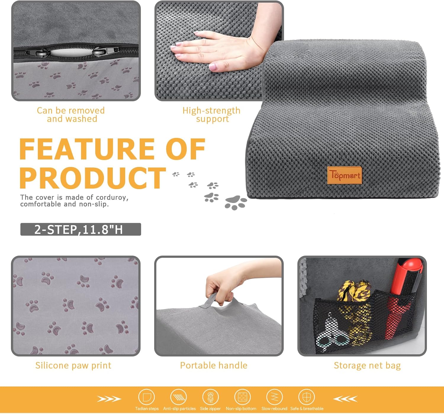 • Safer,Wider&Deeper Steps:Each step is 15.75in x 7.1in.Our dog stairs are excellent for those older dogs who are less mobile as they age or for cats with injuries. More wide and deep steps are helpful for reducing the strain that constantly jumping up and down onto bed,sofa or car can have on your pet's joints,and Topmart dog steps will not shake and slip during use. The cover made of corduroy is more frictional than other covers, pets will not slip on the stairs.