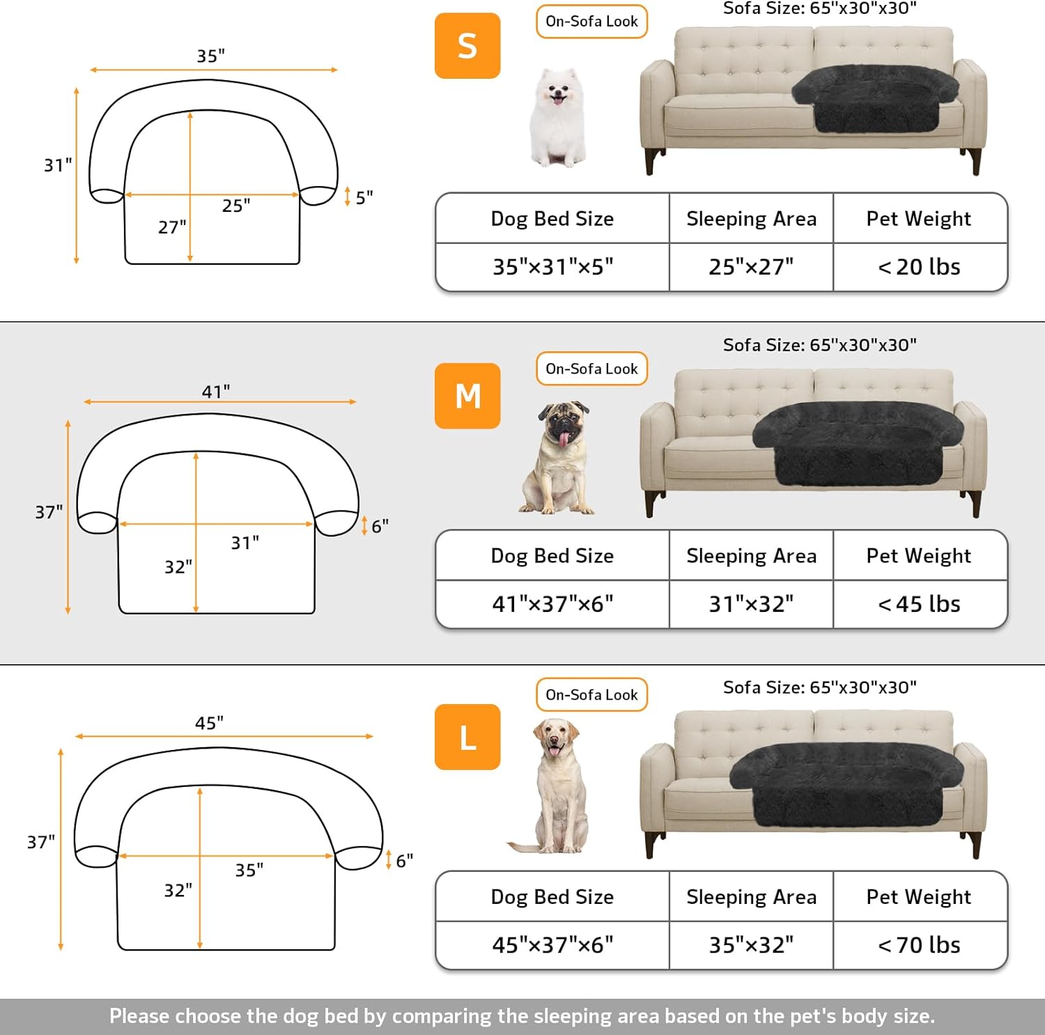• 【Multiple Size Selection】The couch pet bed has 5 sizes for you to choose from. XS: 31"x23.5" dog bed for small pets. S: 35“x31" dog bed for cats and small dogs. M: 41”x37" dog bed for medium dogs. L: 45“x37" dog bed for large dogs. XL:53"x39" dog bed for large dogs. We have enlarged the sleeping area for pets to give dogs more space.