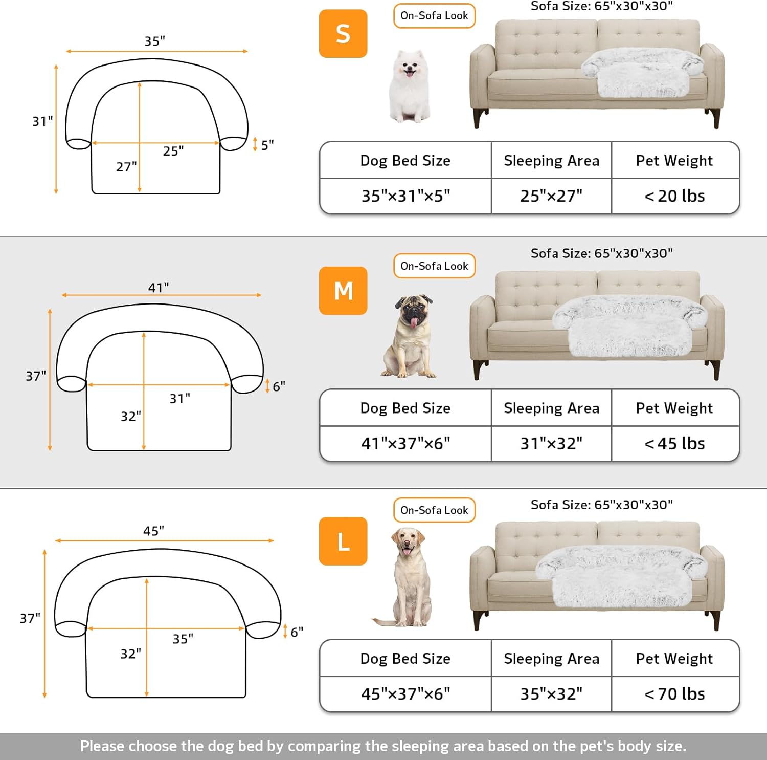 • 【Multiple Size Selection】The couch pet bed has 5 sizes for you to choose from. XS: 31"x23.5" dog bed for small pets. S: 35“x31" dog bed for cats and small dogs. M: 41”x37" dog bed for medium dogs. L: 45“x37" dog bed for large dogs. XL:53"x39" dog bed for large dogs. We have enlarged the sleeping area for pets to give dogs more space.