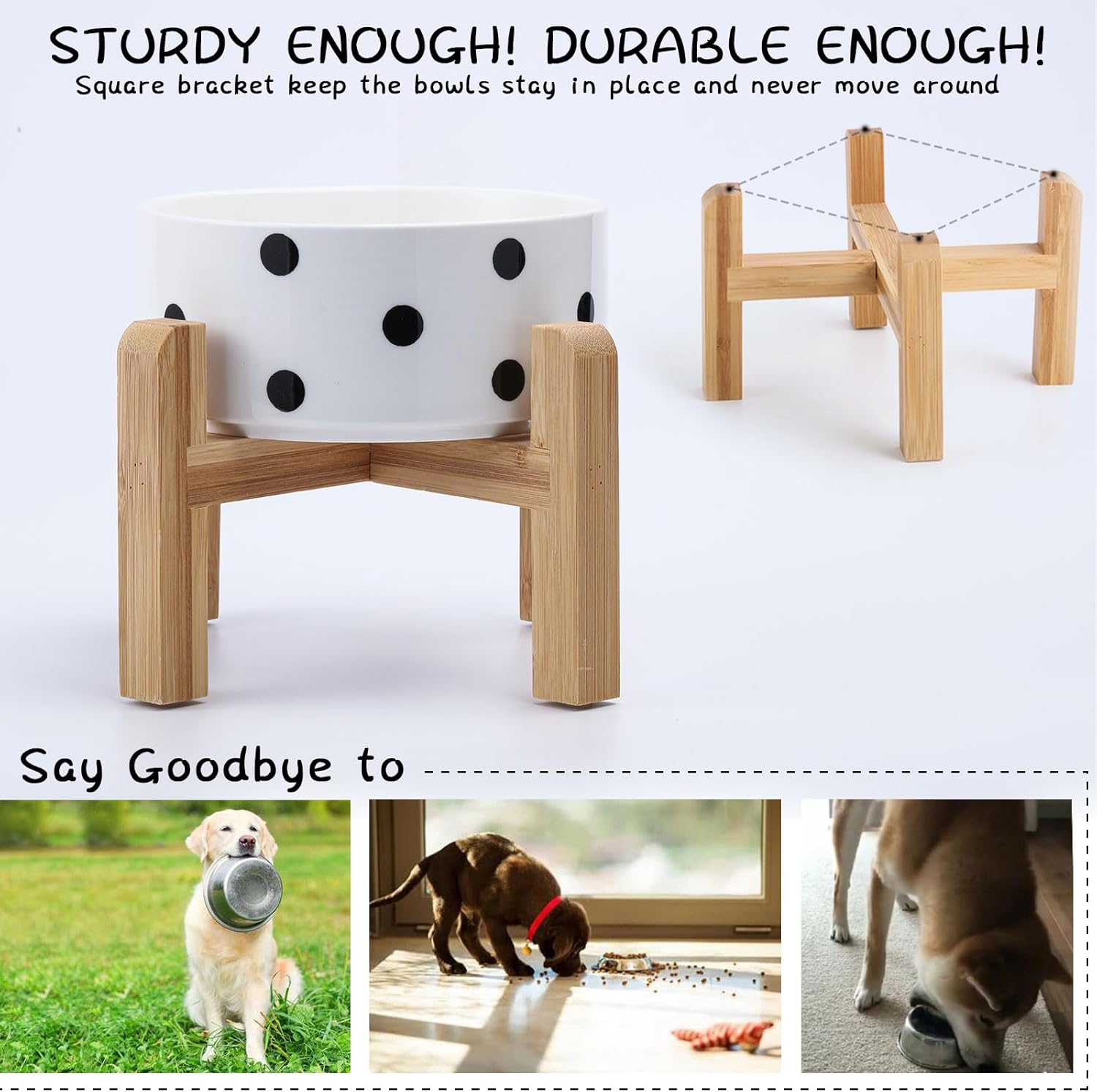 • NON SLIP WOOD STAND -You can get two different heights by flipping the bamboo stand,the elevated ceramic medium size pet bowls are perfect for small and medium dogs from different stages of childhood to adulthood, The wood stand on the bowls stopping ceramic dog bowl from sliding around, Keeps pet food and water in the bowls.