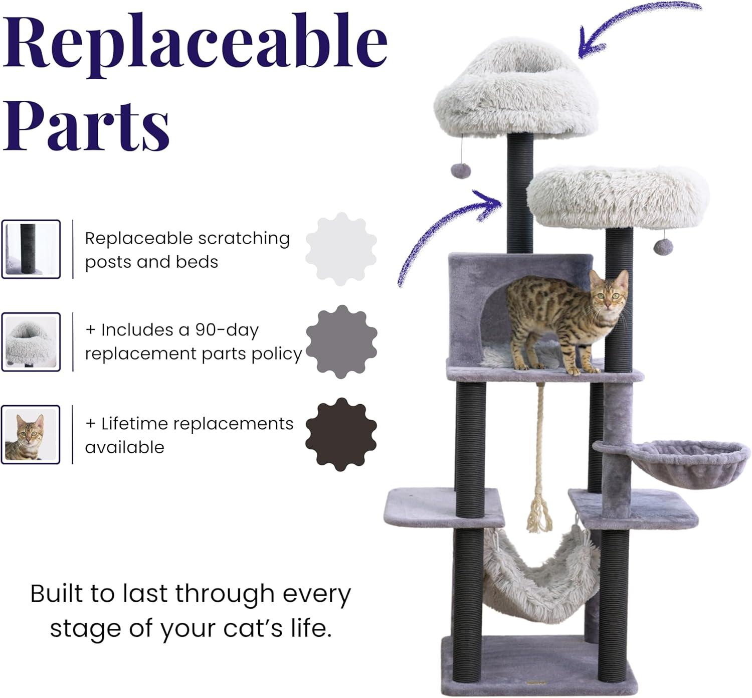 Catry Bradbury 7-Level 62.5” Modern Cat Tree with Replaceable Scratching Posts,Big Condo,Two Washable Beds, Two Hammocks,Quick Assembly, for Multi-Cat Homes(Cloud Gray)