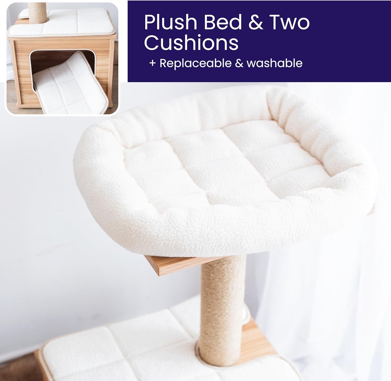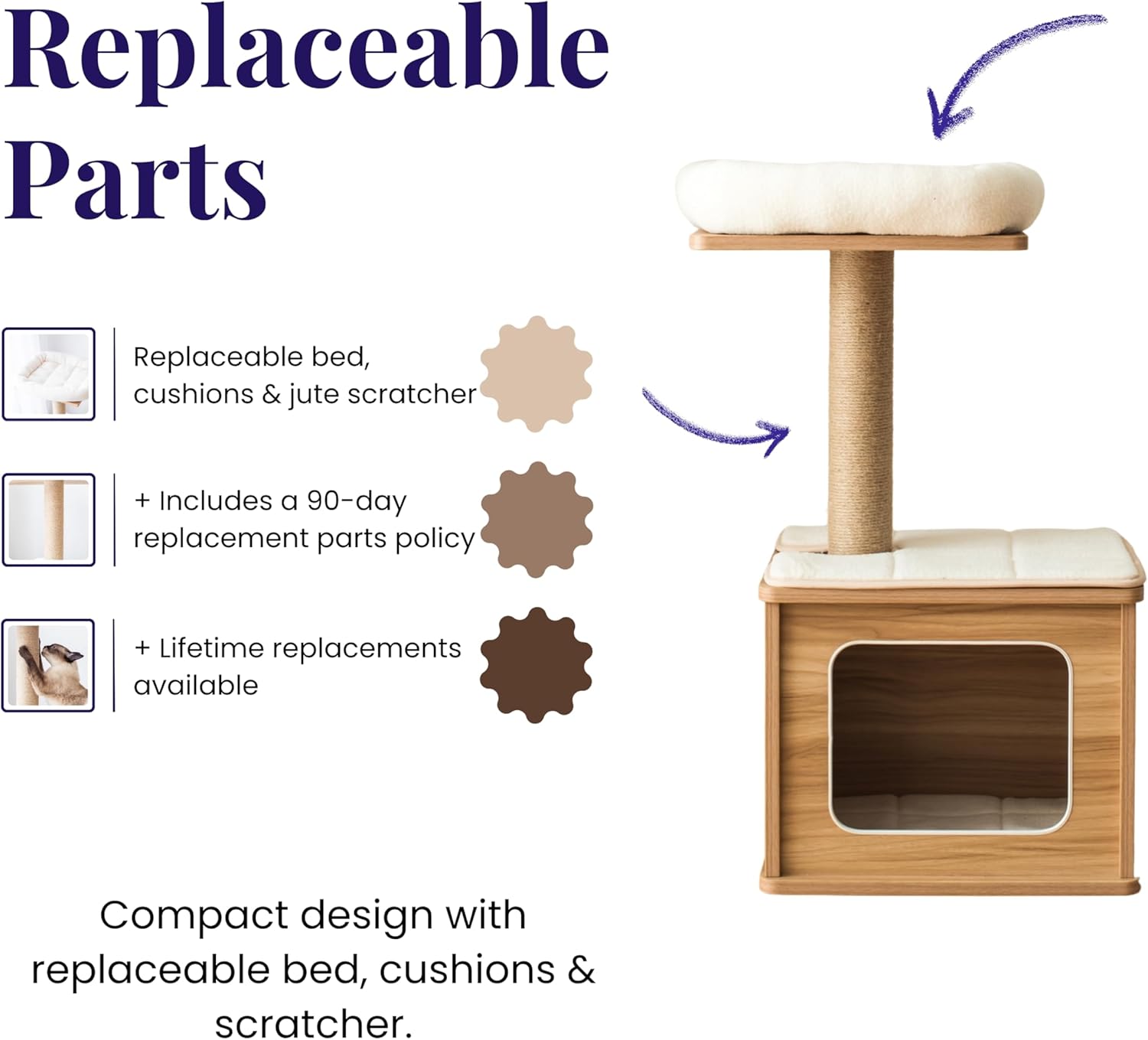 • Replaceable scratching post and pads.
