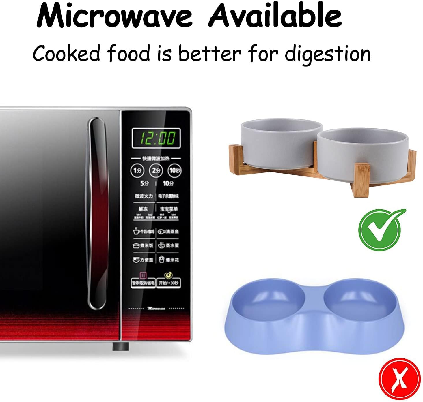 • Double Bowl Design - One bowl for food and one for water for dogs or cats , Each cat dog ceramic bowl has a Unique bamboo stand, raising the dishes closer to your pet for more comfortable eating.