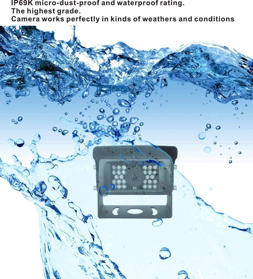 - ใHEAVY DUTY CAMERAใIt is a color 1080P camera, provides super clear and real color image. The viewing angle is 120 degree. With waterproof rating IP69K(the highest level), with night vision. So it works perfectly in kinds of weathers. With Heavy duty, 10G vibration-proof rating, it works well with the vehicle which has intensive vibration in extreme conditions.