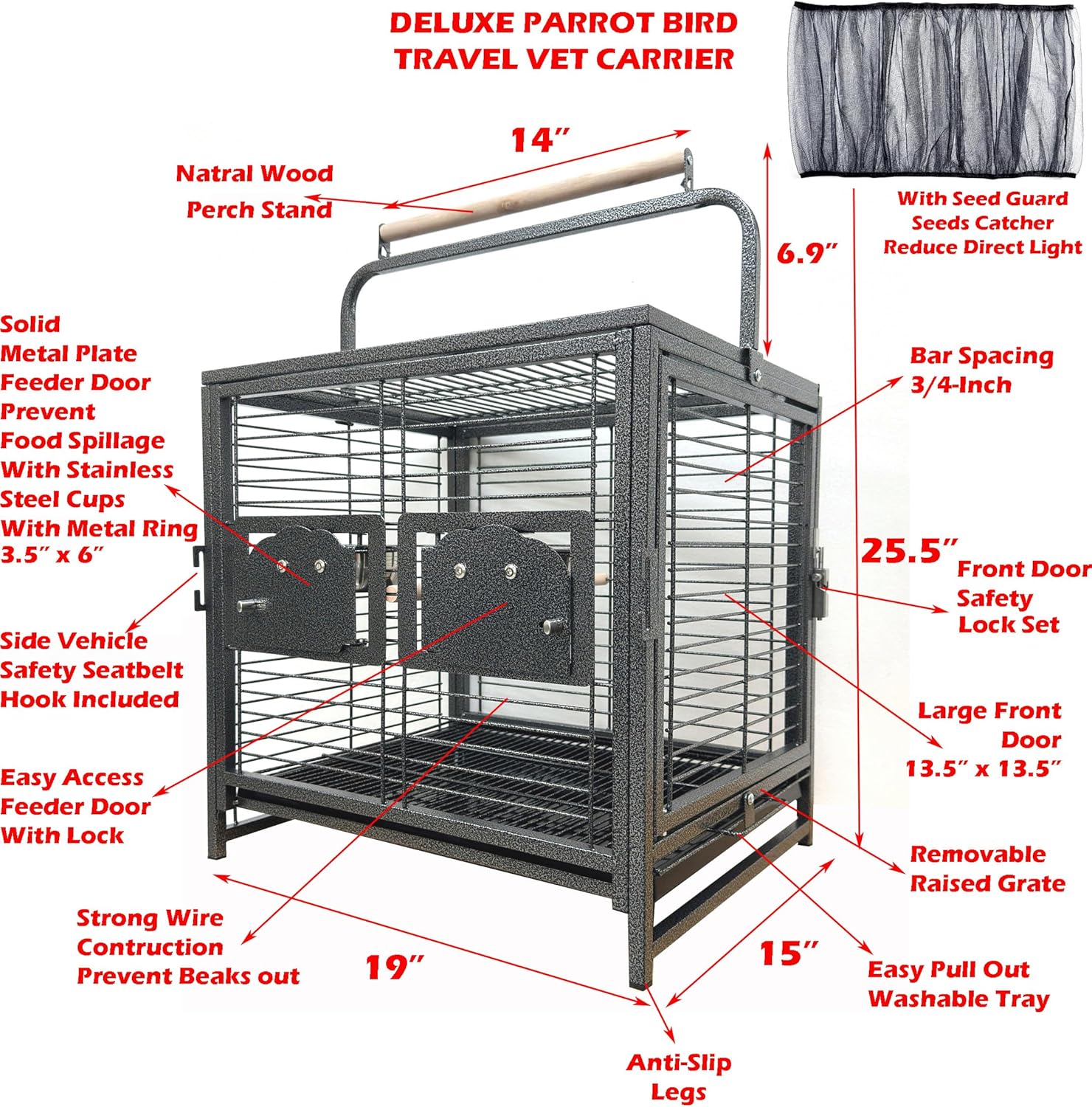 • 【CONVENIENCE】Portable Design. Top Easy Comfortable Carry Handle With Wooden Playing Stand For Your Bird, Swing Away Solid Metal Plate Feeder Door Prevent Seed Spillage With 2 x Stainless Steel Bowls On the Metal Ring. Large Easy Access Front Door: Size 13.5 x 13.5H. Side Vehicle Safety Seatbelt Hook Included.
