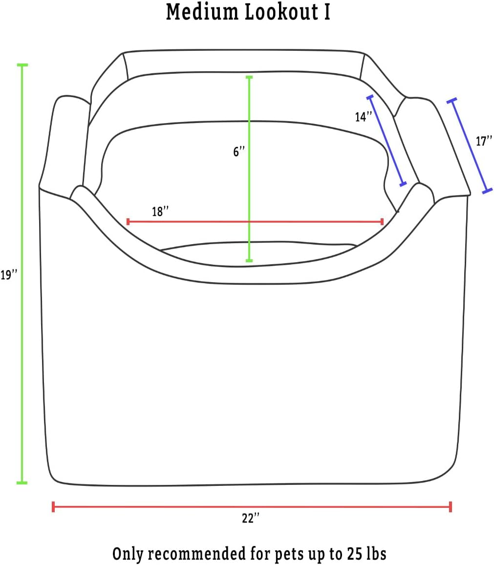 - This dog booster seat for small dogs under 25 lbs raises your pup 6โ to allow easy viewing out of the window. The removable pillow can add additional height if necessary. The enveloping microsuede interior is 18โ x 14โ and boasts 6โ tall sidewalls to secure small breed dogs under 17โ in length (like pugs, corgis, and dachshunds) within the dog car seat. The Lookout dog car seat measures 17โณH x 22โณW x 19โณL and is an ideal back seat or front seat dog car seat, fitting snugly inside a single seat.