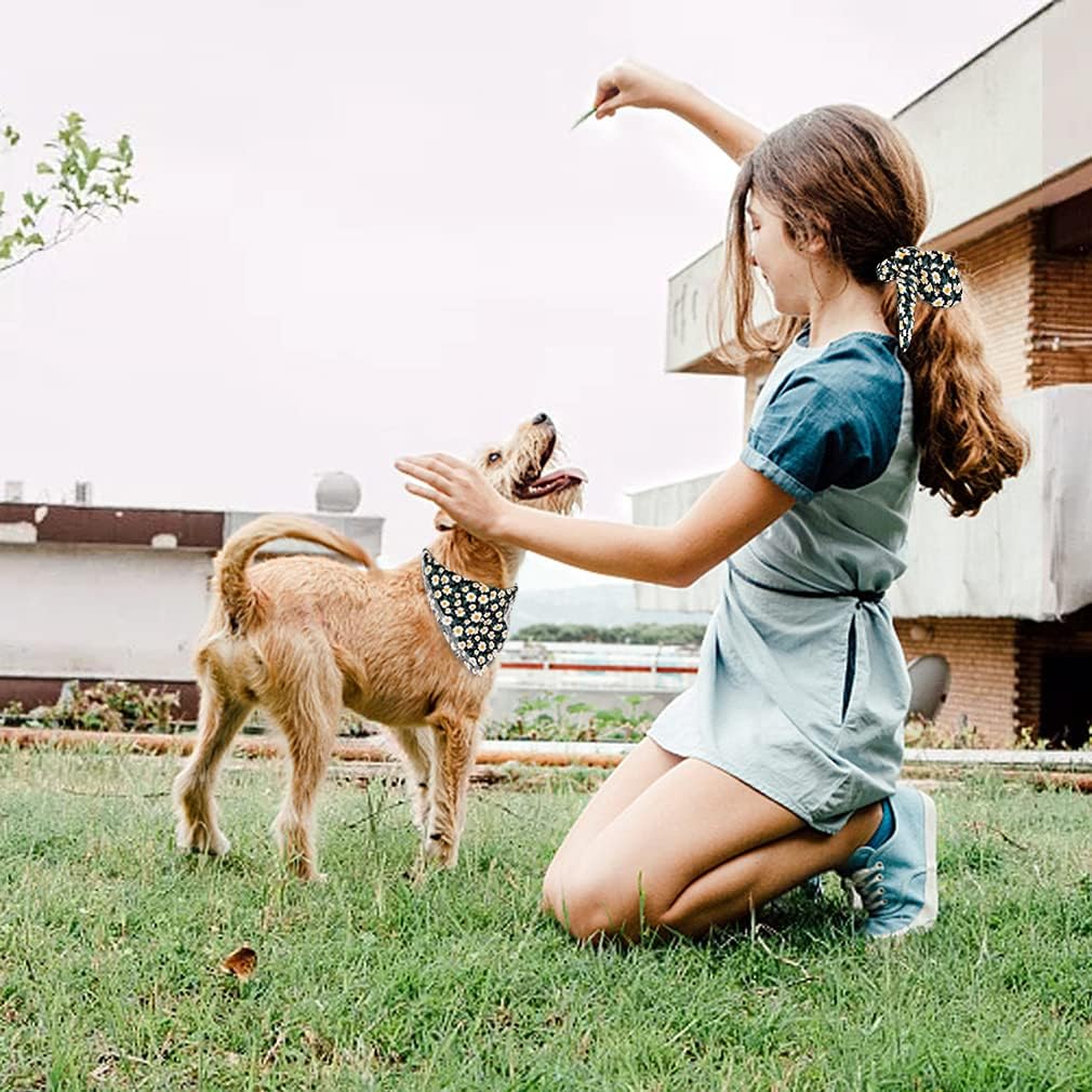 • Matching Bandana and Scrunchie Set - It’s full of love when your pets is wearing the black flower bandanas and you are wearing the bow scrunchies. When traveling, sleeping, taking photos or daily walking, adorable spring doggie bandana and floral scrunchie is a pretty accessories. The scrunchie can be worn as a wrist accessory and hold your hair. Beautiful dog drool bib and scrunchie with white floral and geen leafs pattern, it’s nice photo props.